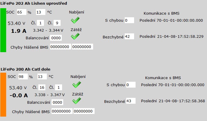 - BMS mi už pomohla odhalit jednu obtíž s nastavením min a max napětí baterek, o které jsem psal (https://forum.mypower.cz/viewtopic.php? ... 40#p146065), takže díky ní jsem snižoval float napětí nahoře a zvyšoval min. napětí pro připojení na síť dole. BMS mi pěkně ukazuje na rozdílech napětí a proudů "nahoře" ev. "dole", který ze dvou packů je "lepší" a který "horší":