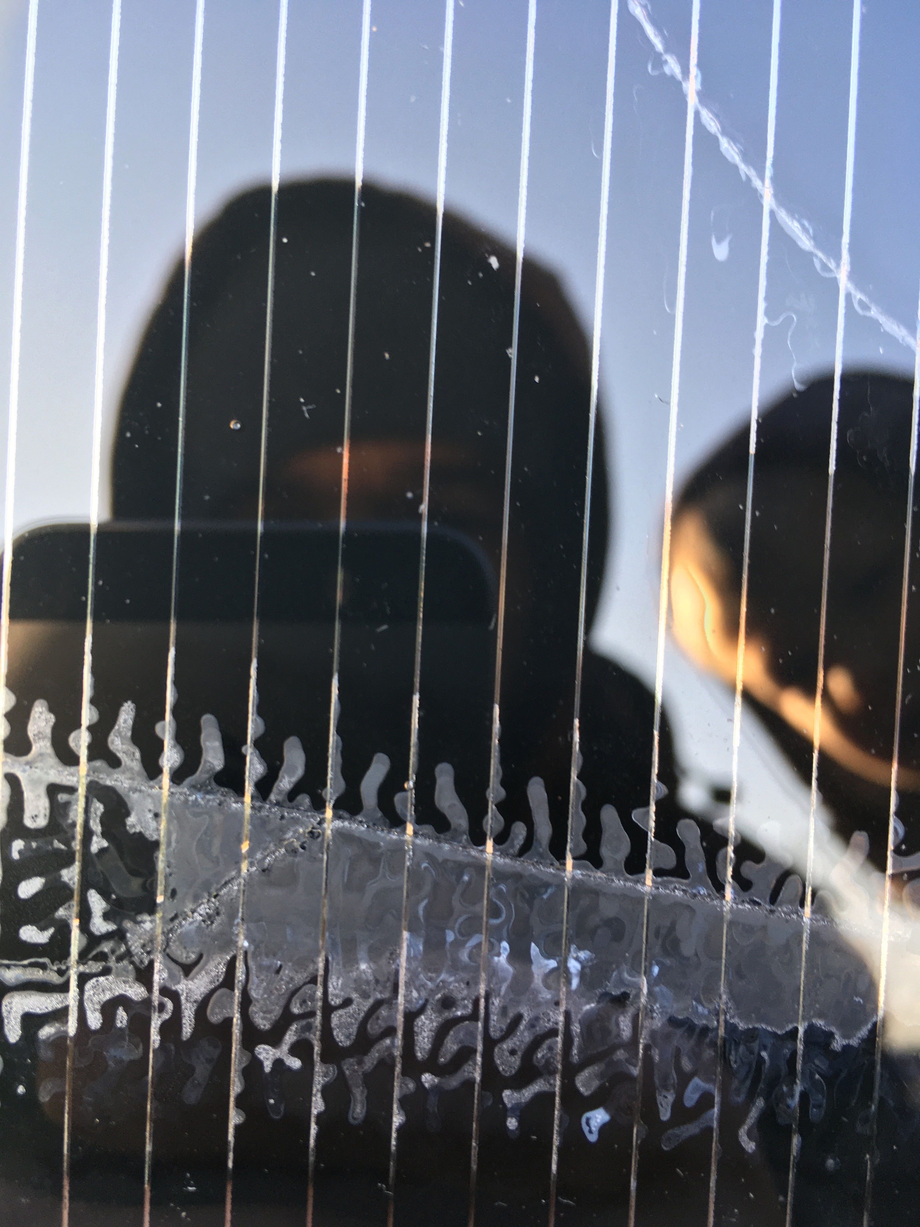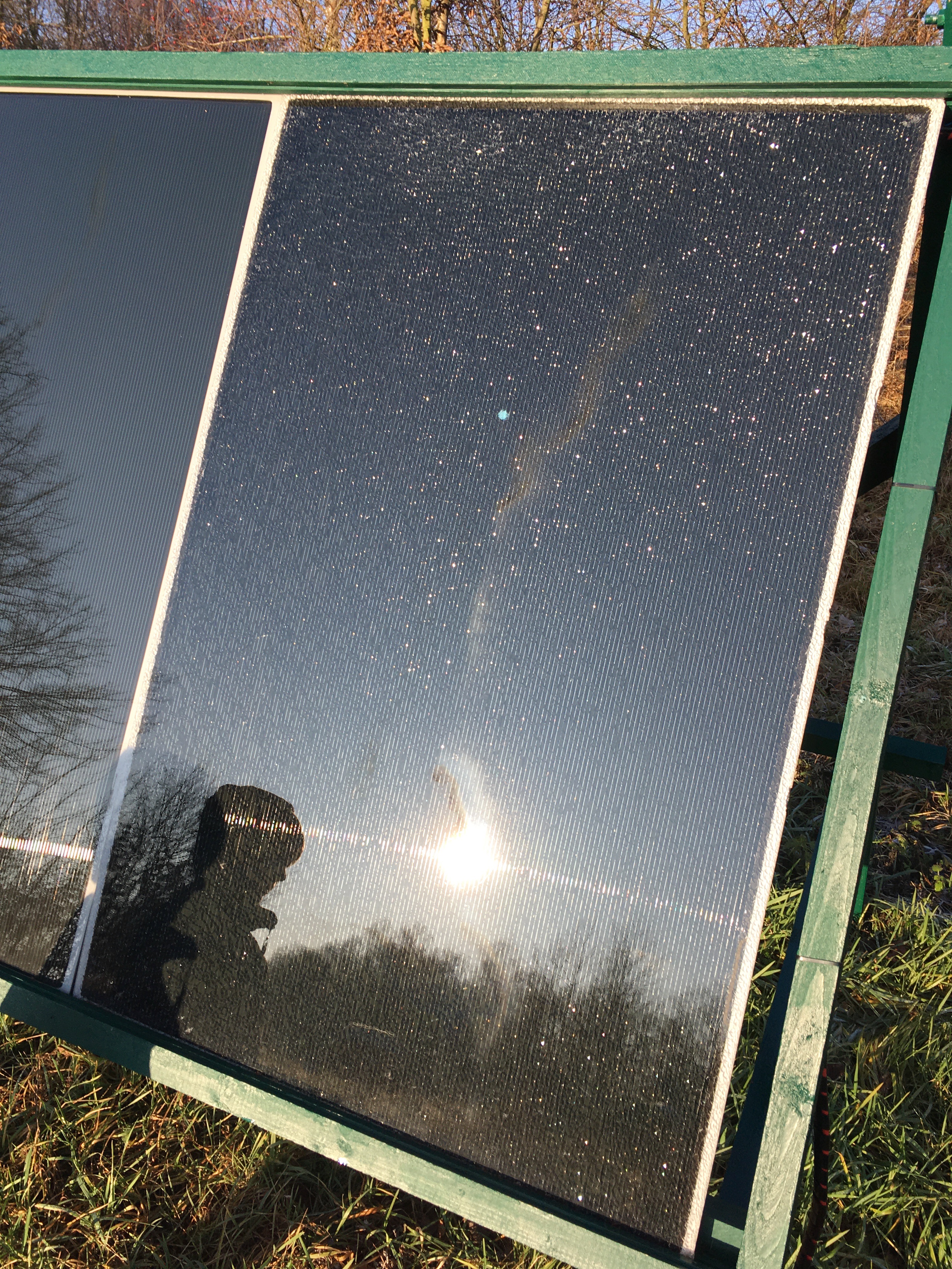 Mám dočasně umístěn jeden string 3s skoro vodorovně. Za dešťů voda stékala u dvou panelů k jednomu rohu spolu se spláchnutou špínou a tam se poslední zbytek vody odpařil a špína zůstala. I takové zastínění části článku, které opticky nevypadá nijak strašně, se projeví jeho vyšším zahříváním, které je vidět infra kamerou. Nejedná se o vadu panelů, protože po umytí špíny byla teplota celého panelu stejná.