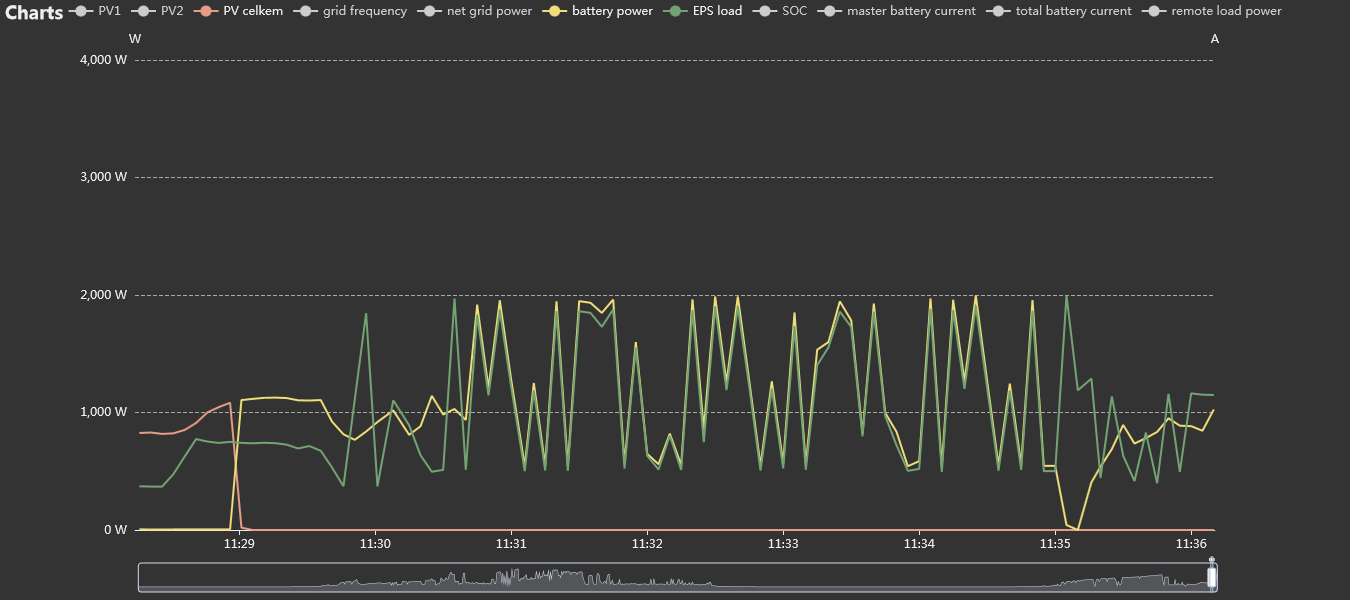 Vše funguje jak má, střídač má zaplý "zero export" a do sítě distributora tak nic nejde. Jediné co mě zlobí je indukční deska - pokud nejede naplno, tak režim - "zapnuto x vypnuto x zapnuto x vypnuto" v sekundových nebo několikasekundových intervalech dostane střídač do stavu, že výrazně sníží produkci z panelů a prakticky zastaví příjem z baterky. Ke střídači jsem připojil ESP32 a udělal si vlastní podrobnější monitoring - zde po pěti sekundách: Během vaření výkon panelů z cca 3 kWp snížil na 600 Wp a sosal watty ze sítě. Indukční deska je Mora (nemá na sobě napsán konkrétní typ) a ačkoliv s ní jako takovou není problém, tak toto mě se.e.