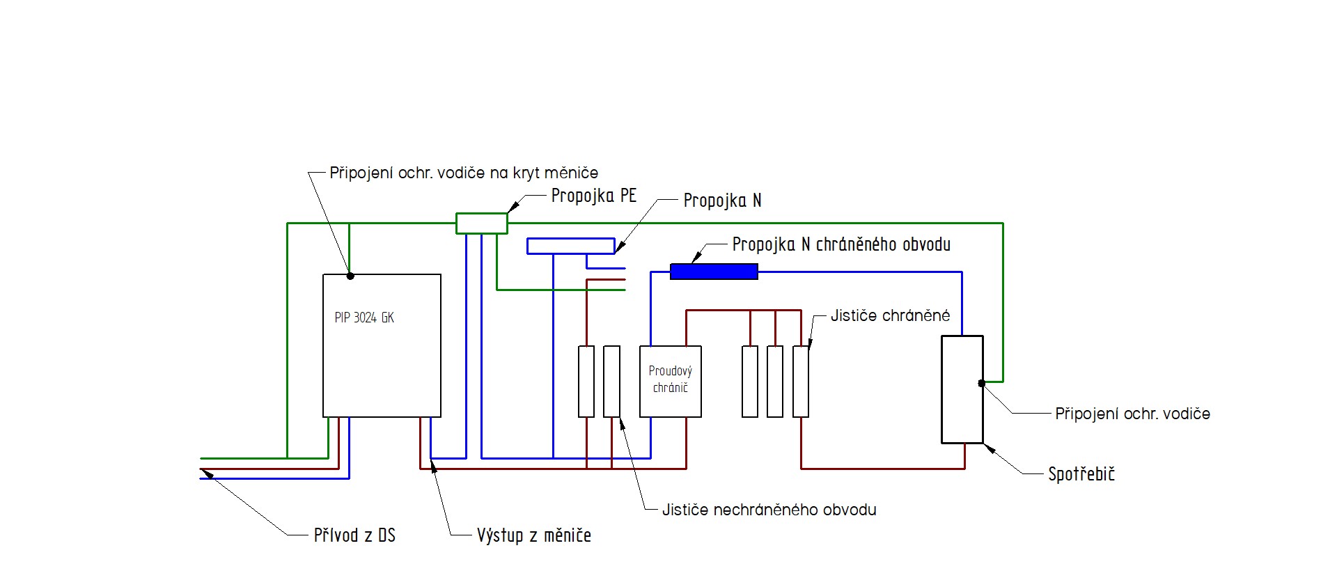 Já propojuji modré - vstup s výstupem měniče. A nevytvářím za měničem nový bod rozdělení PEN->PE+N. Zatím jsme to všichni přežili.