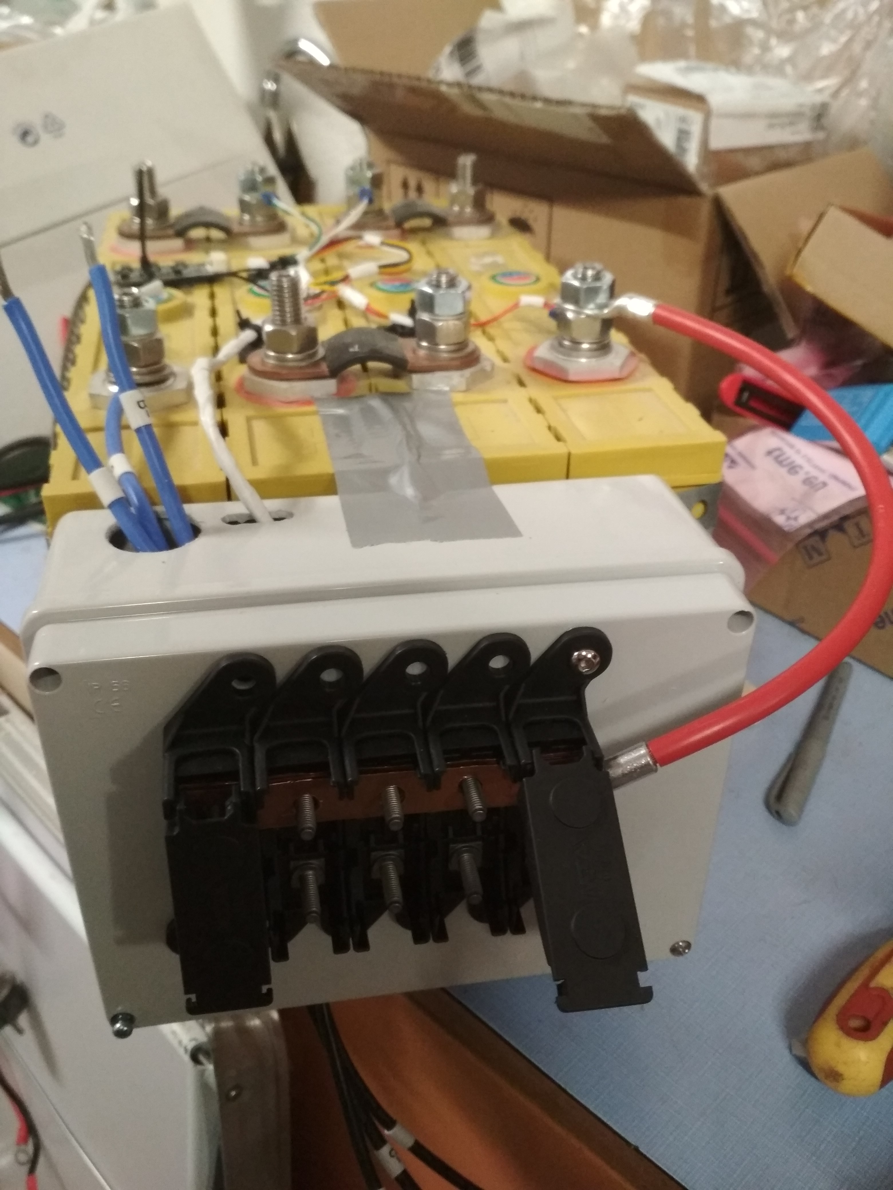 Box je z překližky a bude to ve skříni z překližky. Tloušťka co dům dal. Ještě uvažuju to tam dát bez bedny - ušetřil bych místo. Ono tam nakonec není dost místa, takže vedle baterky bude asi jen BMS. Měnič půjde do skřínky u stropu (plánuju ho používat opravdu příležitostně, takže bude vyndavací na konektoru XT90 a bude provozovaný jen s otevřenýma dvířkama). MPPT půjde asi zpátky na stěnu hliníkové bedny s chlazením pro ledničku a síťovou nabíječku dám asi na místo originální síťové nabíjekčky. Ještě je to v procesu.