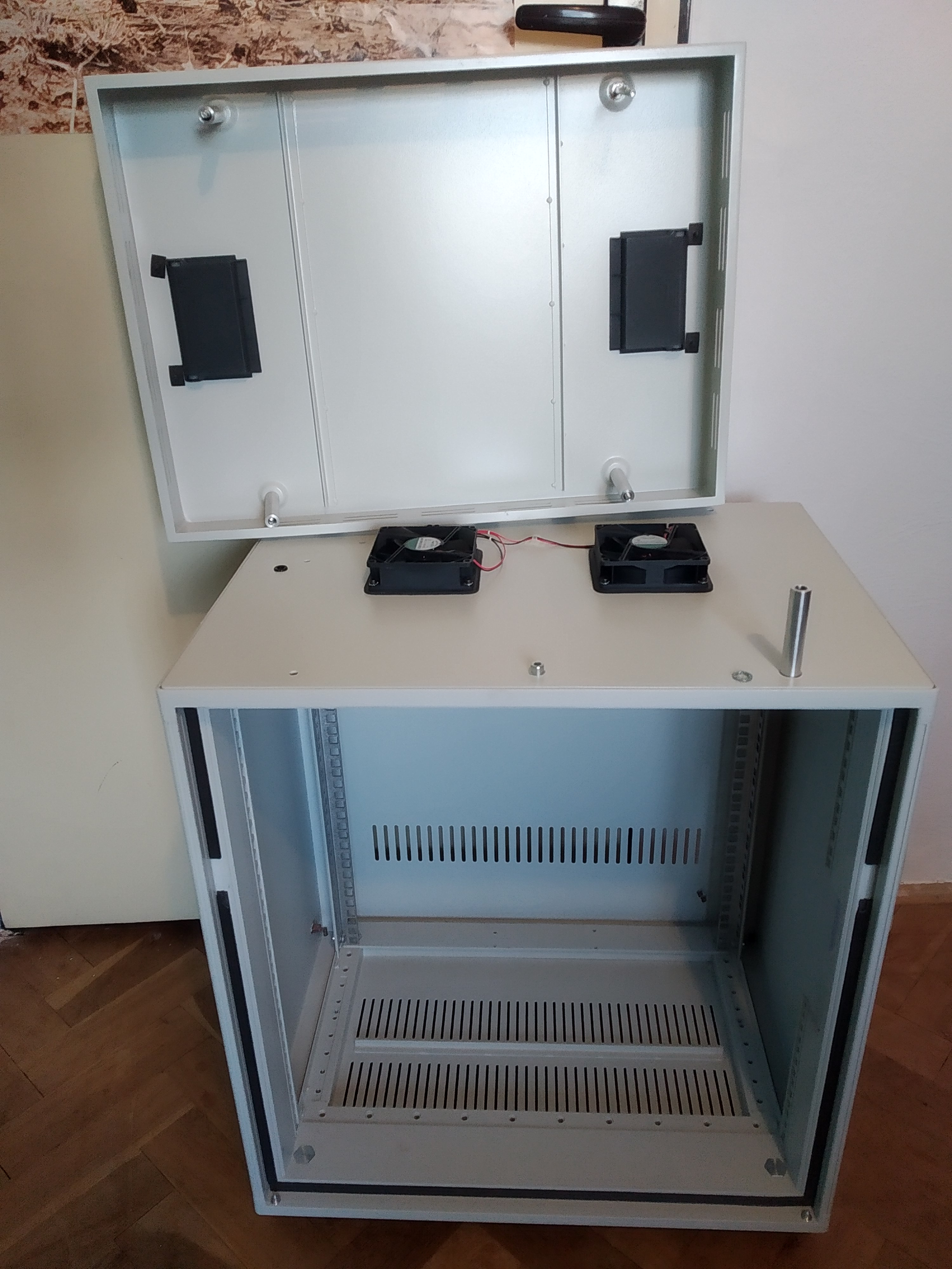 Nabízím rackovou skříň o rozměrech 550x400x660 mm (700 mm s kolečky) s odnímatelnými kryty ze všech stran a výřezem pro kabely. Skříň je vybavena dvěma 24V ventilátory pod horním víkem a doplněna o spojovací materiál a podpůrné L profily. Osobní odběr je možný v Brně, s možností dovozu po trase Brno-Praha-Plzeň za cenu 2500 Kč.