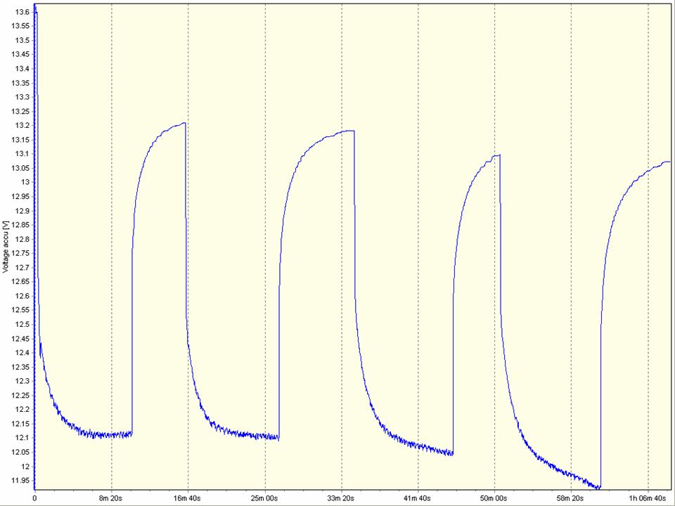 Zdravím, takže ten zub před půl jednou je zátěž kolem 800W na odhadem 60% DOD 200Ah baterii. Napětí kleslo z 13,2 na 12,5, kde se po celou dobu zátěže drželo, takže podpěťovka neměla co na práci. Teď už chápu