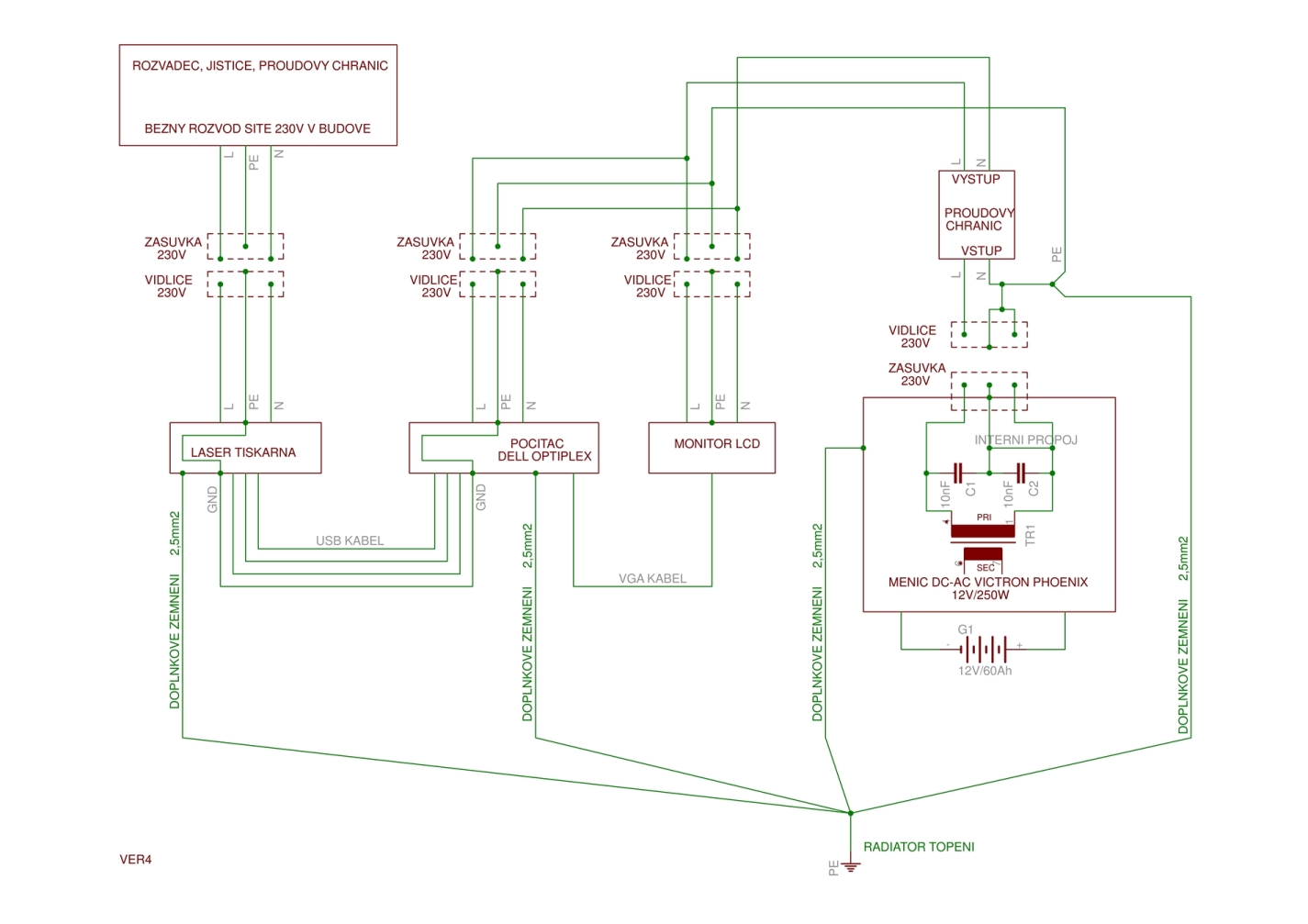 Za mně dobré,za předpokladu,že k radiátoru vede pospojení od HOP a na něm se všechny vodiče spojí na svorce.Ideálně samostatný vodič od HOP k místu rozdělení-měnič a druhý na radiátor.A vhodnější,nikoliv nezbytné, by bylo kdyby laser tiskárna byla napájena také ze zálohovaných zásuvek.Průřez vodiče by měl být min. 4mm2,pokud je alespon nějak chráněn před poškozením.Také bych upřednostnil vynechání vidlice u měniče a realizoval pevný spoj.