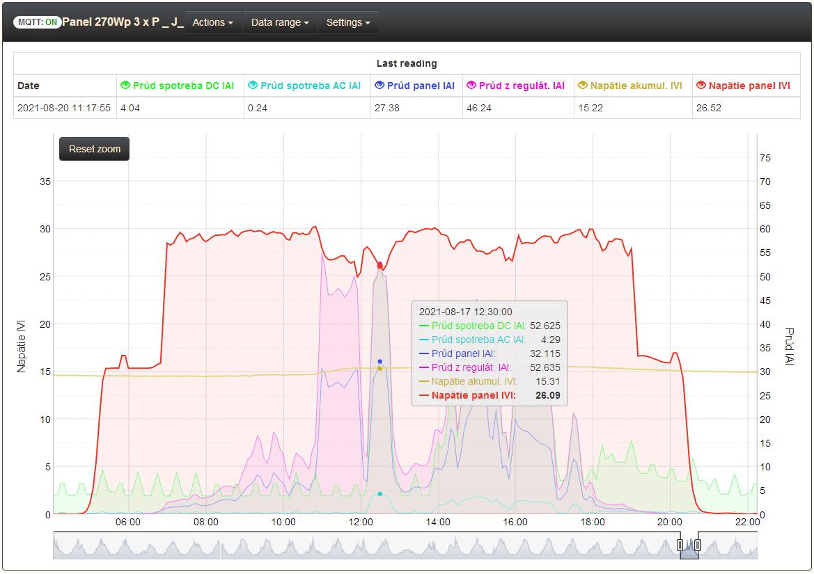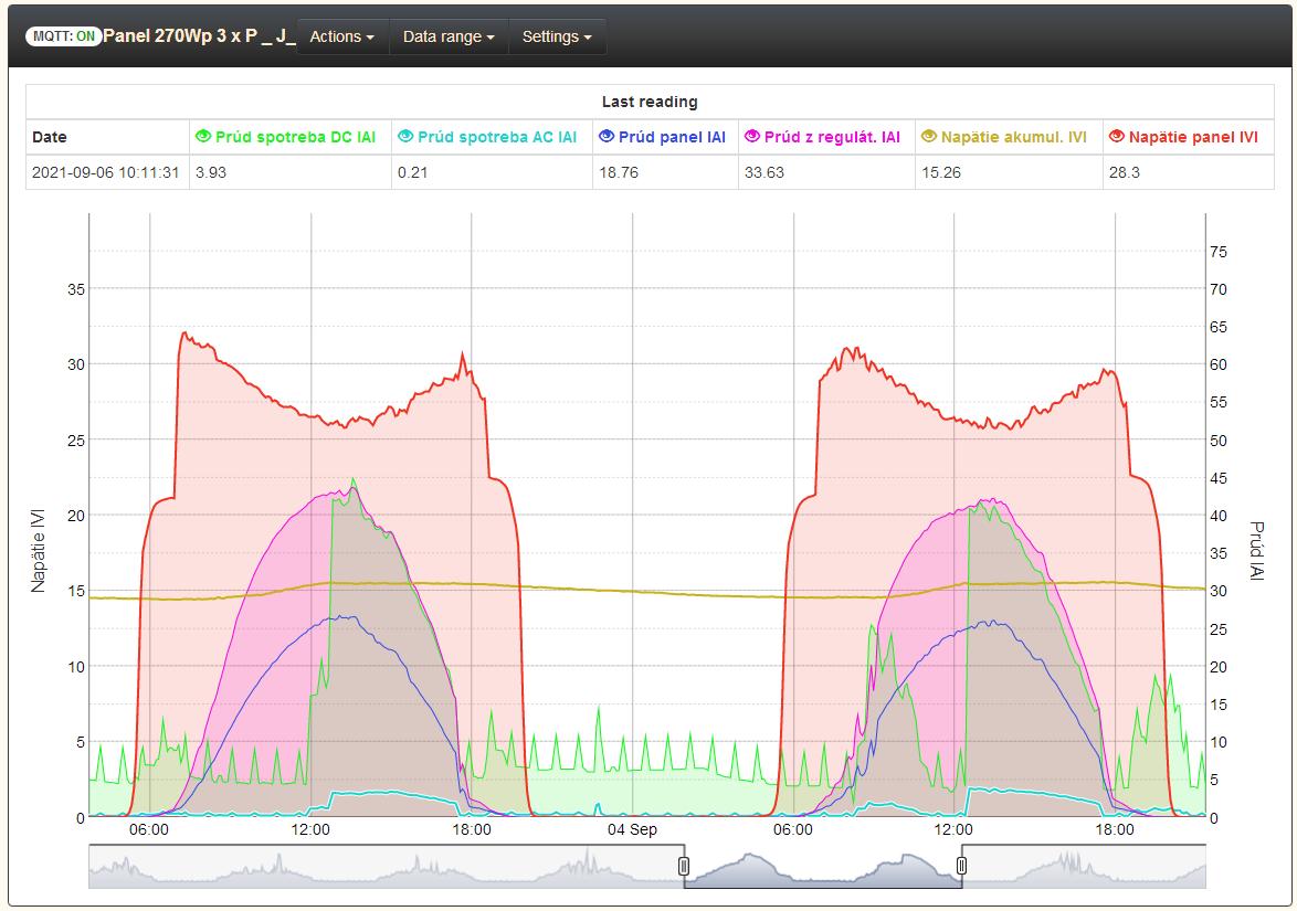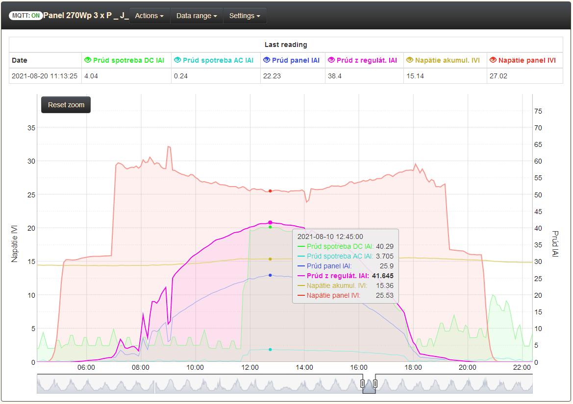 Teraz keď je slnečný a chladnejší deň ide z regulátora vyše 50A, pre môj terajší akumulátor je to tak akurát.
