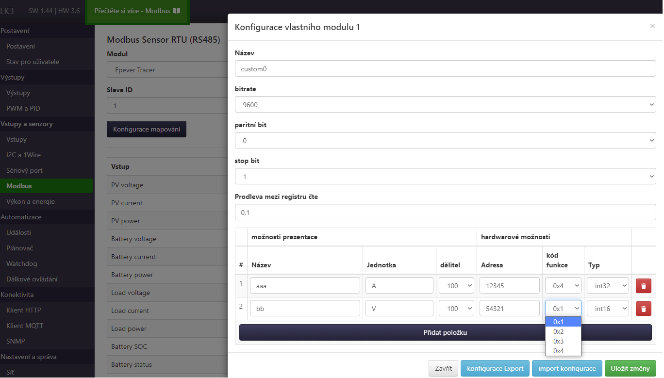 Do LK pridali možnosť, že si môžem nakonfigurovať vlastnú komunikáciu cez Modbus.