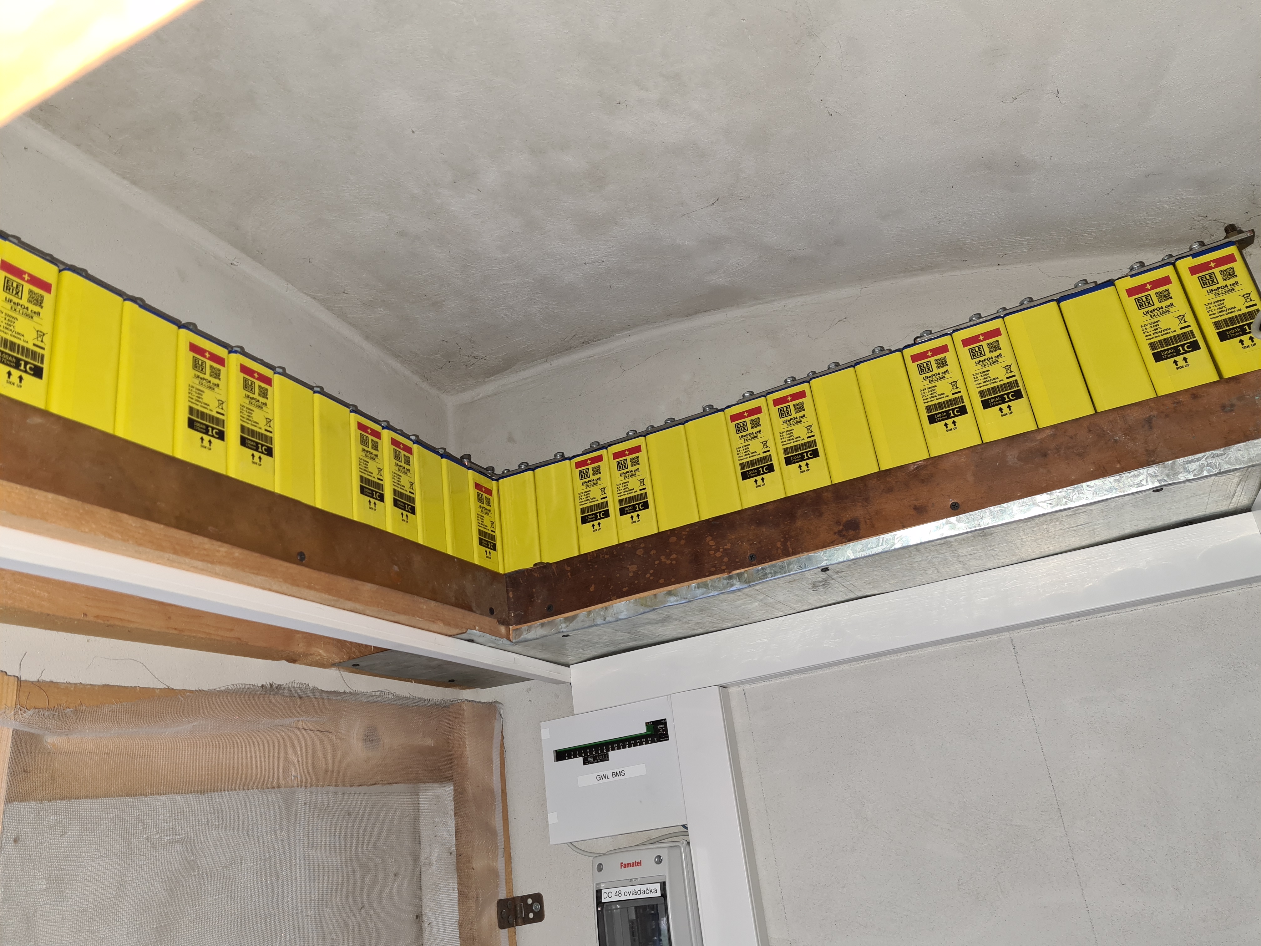 Zatím nejsou 35mm přívodní kabely namontované, musím si někde půjčit lisovací kleště. Montáž balancerů Volba padla na koutovou baterii, vzhledem k záplavové zóně umístění na zem nepřicházelo v úvahu Měnič zatím nemám, tak je na zdi zatím jen funkční BMS připojené přes PoE do routeru