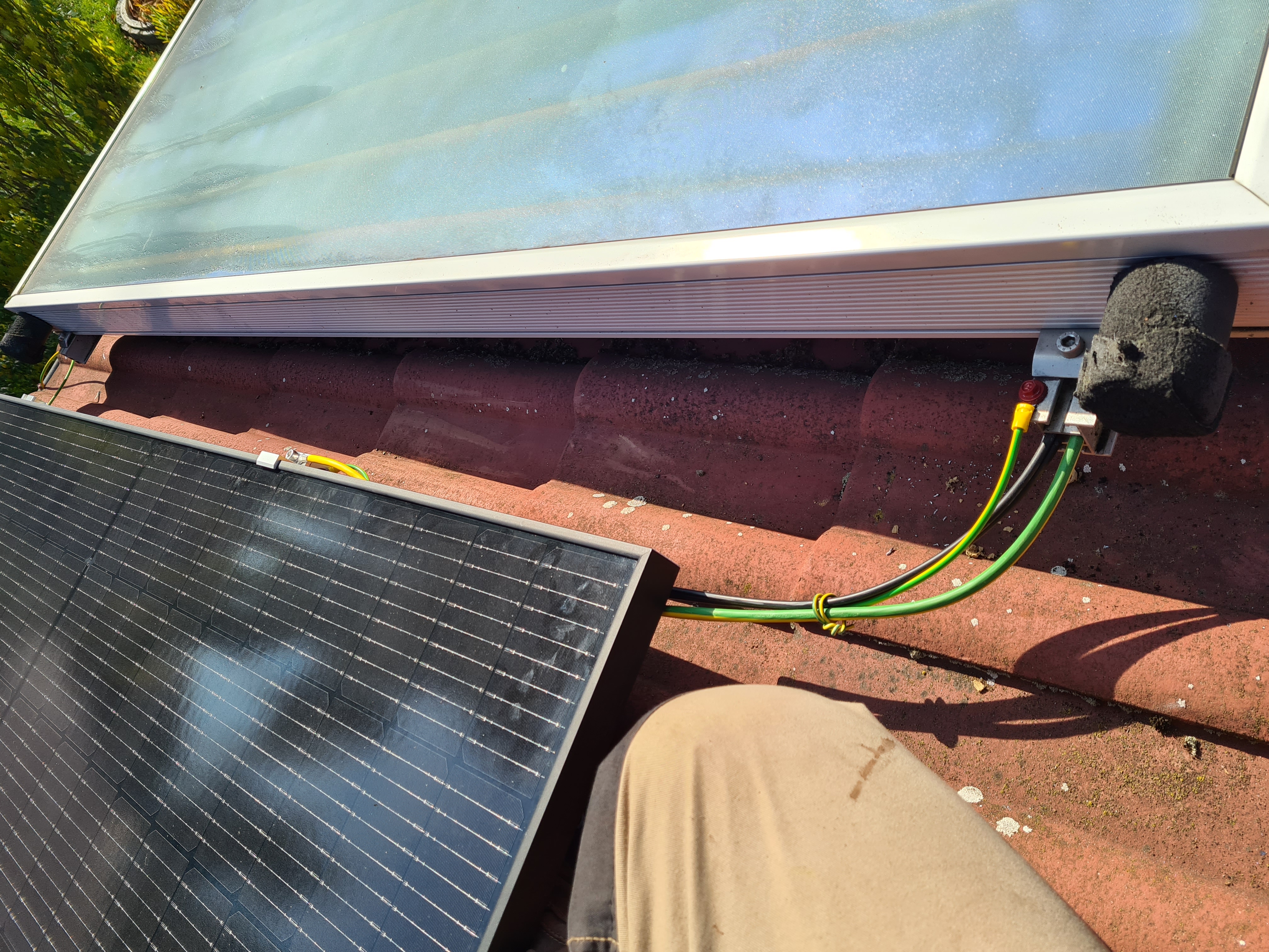 Snažil jsem se si dát záležet, aby kabely neležely na střeše a vše přivázat na panely, nebo na konstrukci. Použil jsem na vázání měděnou 1.5ku, vázací pásky i s UV filtrem se vždycky rozpadnou. Nahoru jsem vytáhnul zemění o průřezu 16mm, pak vše pospojeno 6kou.