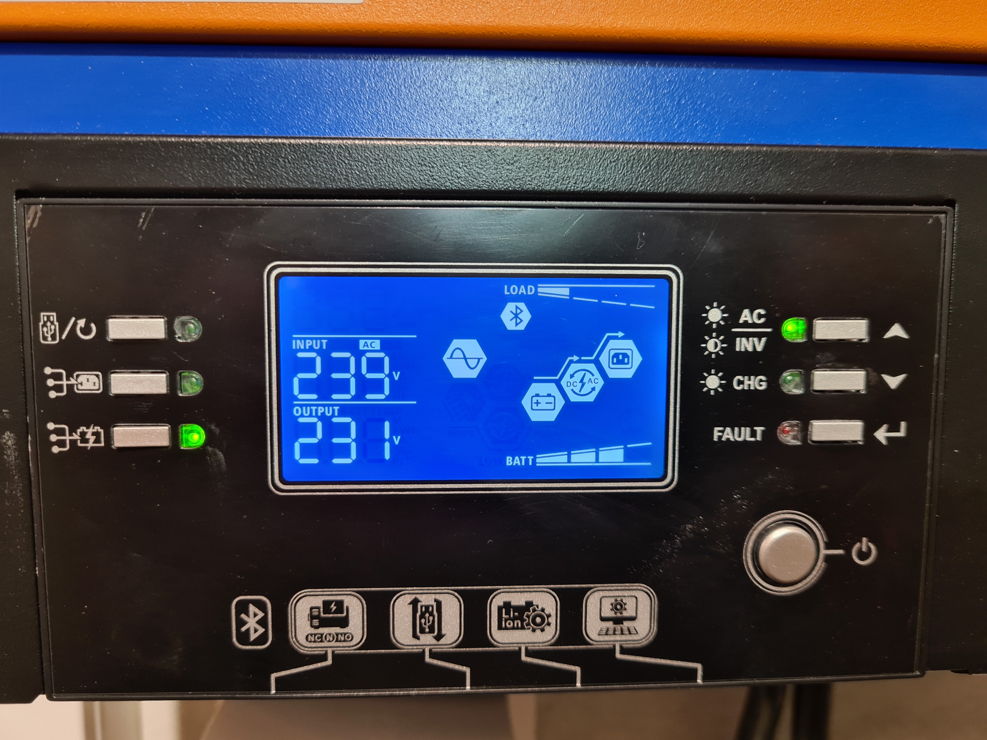 Tak a je to tady .... Přijel měnič. Odpoledne jsem zapojil a teď v noci rozjel. Dokonce jsem dosušil jedno prádlo v sušičce na baterky.
