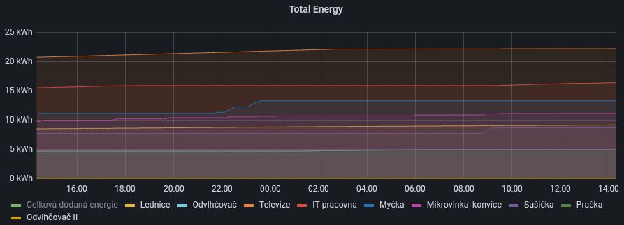 Systém doplněn o ztasmostizované zásuvky Gosund SP111, měřím skoro všechny spotřebiče. Cena jedné zásuvky cca 260Kč. Takže spotřební depka. Tady je výstup měniče, kde je zbytek. Světla,kotel a pár okruhů zásuvek.
