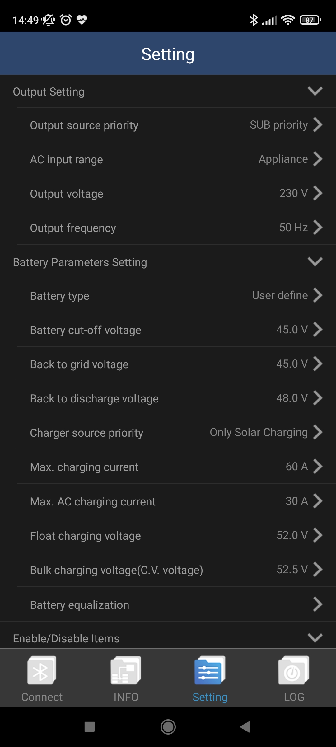 Myslel jsem to tak, ze kdyby byla datova komunikace, tak by ty napeti davaly smysl. ted WatchPower pise napěti baterky 48,7V, a pritom PIP rve, chybu A4. A nevim proc. kde ja nastavena hodnota, ktera je mezní pro upozornění A4.