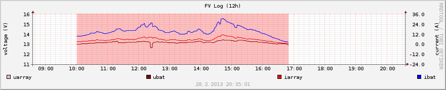 Zdravím, takže ten zub před půl jednou je zátěž kolem 800W na odhadem 60% DOD 200Ah baterii. Napětí kleslo z 13,2 na 12,5, kde se po celou dobu zátěže drželo, takže podpěťovka neměla co na práci. Teď už chápu
