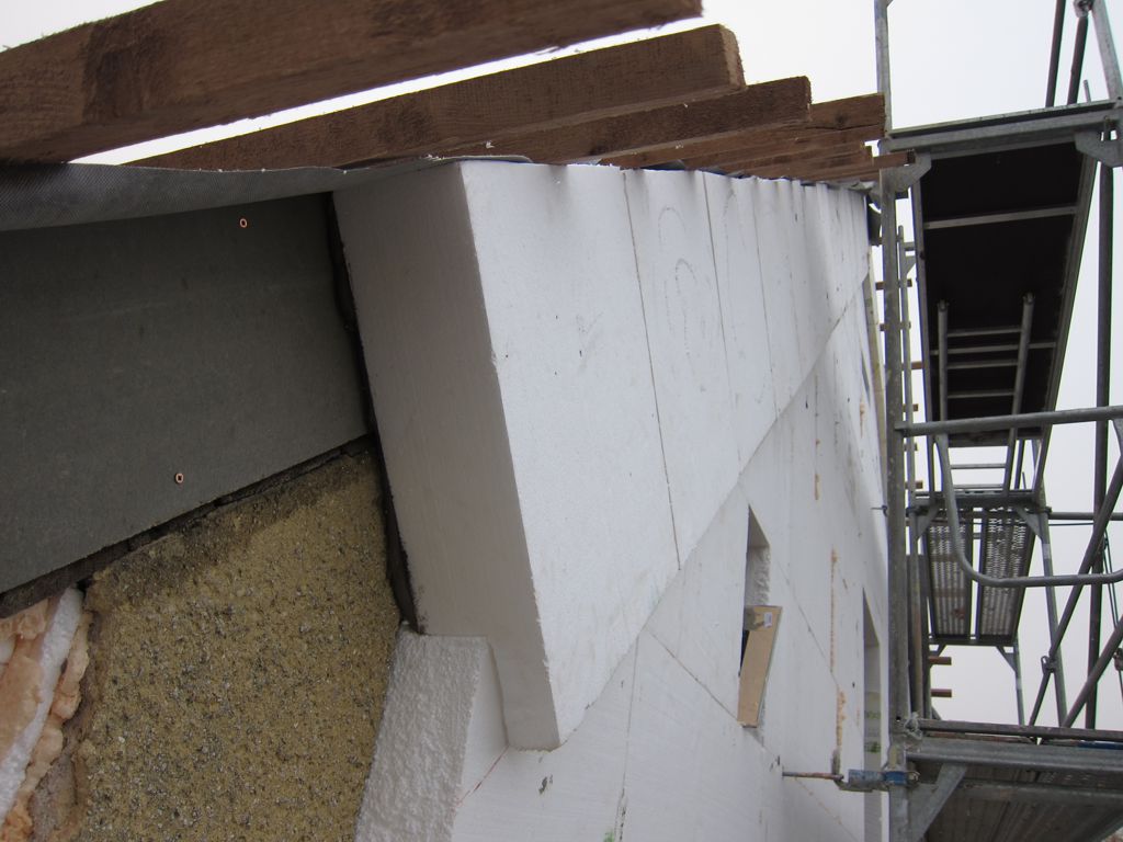 Tohle je jen ukázka té nekrokevní izolace kterou jsem dal nad prkna, co byly pod původním eternitem. Takže ta fólie na prknech je tam spíše jen jako separační vrstva. Pod těma prknama je mezi krokvemi další vata a na ní je teprve směrem do místnosti skutečná parozábrana z pohliníkované fólie. Ta parozábrana je pak vytažená mezi krokvemi nahoru do té části bez izolace a tam je napojená na další parozábranu. Ta dělá na podlaze něco jako „vanu“. Stěny té parozábranové „vany“, jsou vytažené kolem komínů, zdí, trámů až nad izolaci kterou tvoří vrstva fasádního polystyrenu a další vata. Na těch roštech je pak záklop z OSB desek. Ve štítech je ta nekrokevní izolace ukončená s hranou původní fasády (cetris deska) a z venku pak přetažená fasádním polystyrenem až k taškovým latím. Stejně tak u okapu, ta nekrokevní izolace je vytažený mimo stěny směrem k okapu a zespodu, zase až pod ní, je dotažené zateplení fasády.