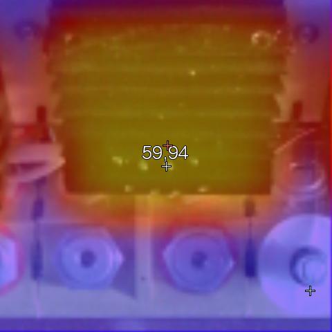 Já v létě při 60,5A na limitu 24V 1800W taky 62 stupňů, po přechodu na 48V žádný problém max cca 35 st. Teď ho mám na stěně v chladnější místnosti, teplota max 25 st. V létě po přidání panelů na 4500W případně dám trubku na ventilátor měniče a budu ofukovat chladič.