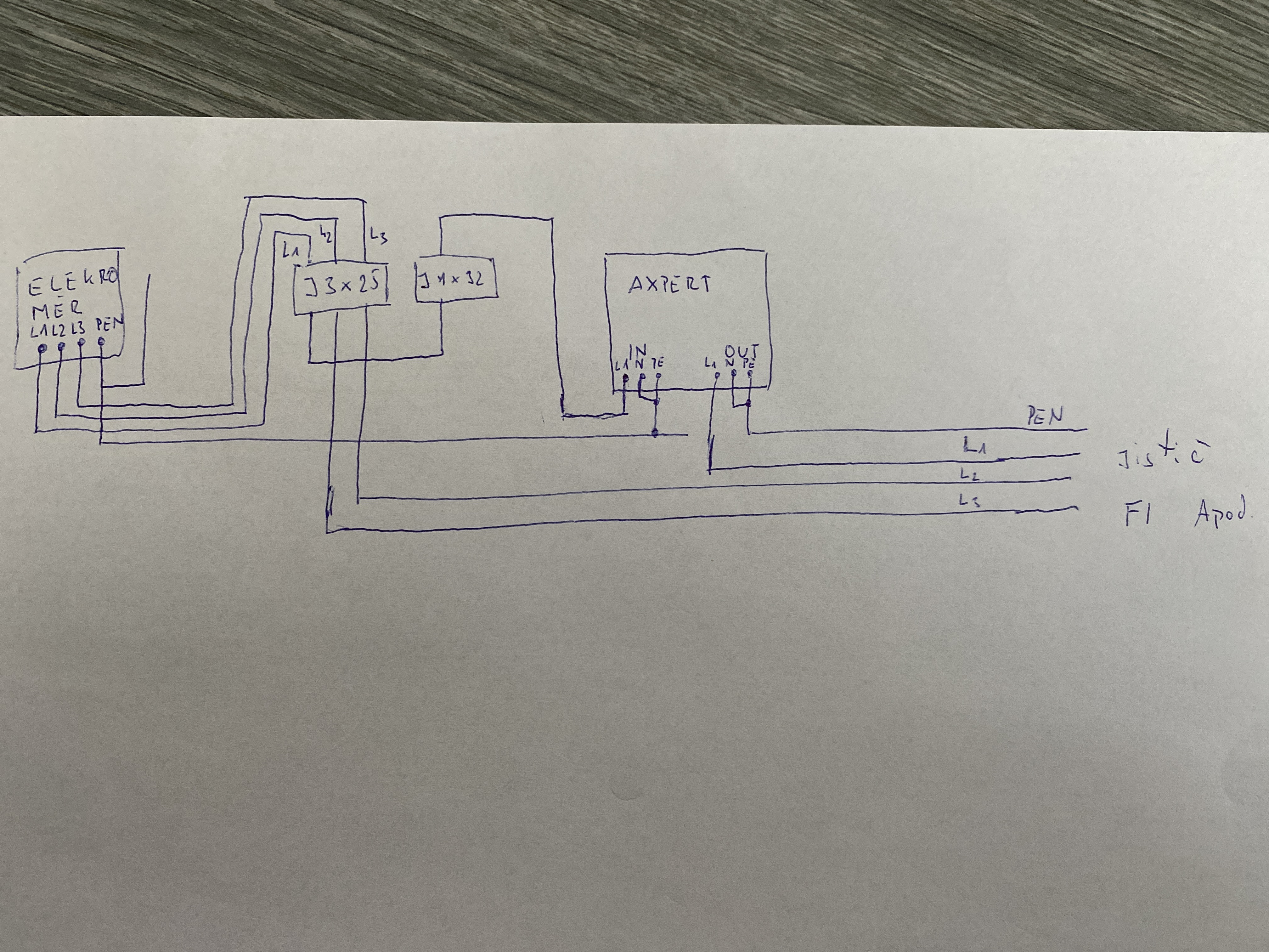 chybí tam uzemění výstupu z měniče pokud není PEin a PEout už propojená v měniči. Jistič 1x32A na vstupu do axperta je celkem zbytečný (pokud to nebude sloužit jen jako vypínač pro případ vypnutí vstupu do axperta) protože dřív vypadne ten jistič 3x25A