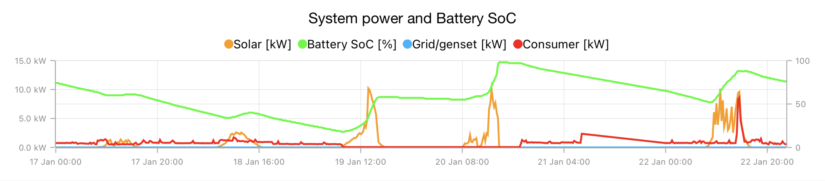 16.11. jsem byl chvíli nucen připojit se na DS z důvodu vypnutí systému BMSkou jedné z 16ti baterii. V 15% SoC hodila error a systém se odpojil. Na radu Docenta jsem nasál 9 kWh z DS, aby jsem dostal baterie na SoC 30%. Jelikož začalo svítit, tak jsem se hned přepnul do ostrova a chtěl jsem to nechat spadnout pod SoC 15% jestli se chyba opět projeví. Bohužel až do dnešního dne jsem se nedostal níže než pod dnešních 30%. Zkouška proběhne jindy.