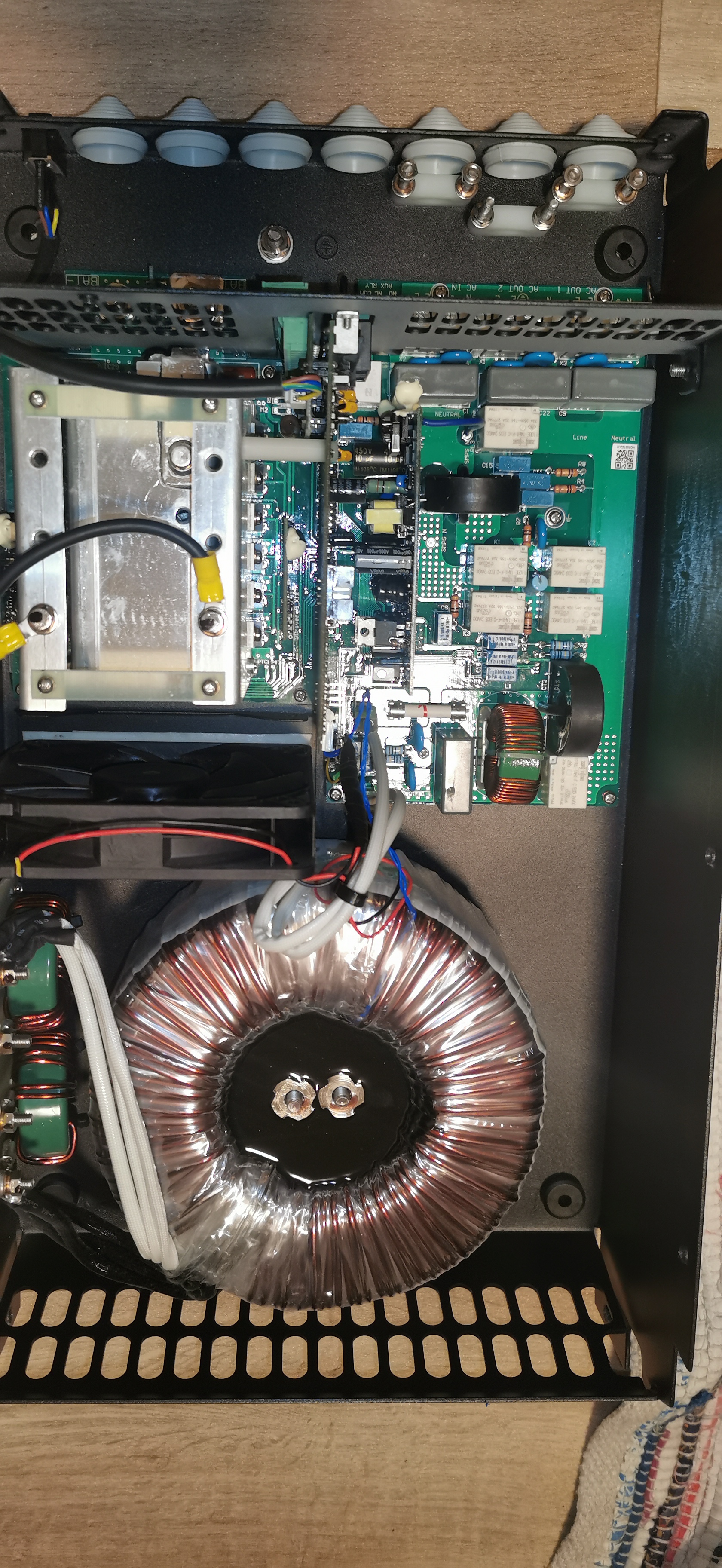 tak jsem díky FRSOvi udělal upgrade na MultiPlus2 5000VA a za to mu děkuji. Předělal jsem kvůli upgradu přívodní kabel z 50mm2 na 70mm2. Do aku jsem přidal druhý pár 35mm2 přívod pro snížení úbytku napětí na kabelech a připravil USB spojku na BMS. Multiplus2 5000VA není o tolik větší, takže se mi vešel i na původní držák a byla to práce jen na jeden den. Pro představu rozdílů přikládám fotky jak strojů vedle sebe, tak vnitřky. 5000VA rodině dává větší možnost použití a nemusí se tolik hlídat souběh, ačkoliv v tom nastavení setrvávám kvůli menší baterce. Co se týče ventilátoru, tak je to stejné jako MP2 3000VA, takže mě čeká předělávka. Co se týče hluku trafa, tak mi přijde hlučnější než MP2 3000VA. Hlavně by mě zajímalo, jestli při bypass vám taky nějaká cívka uvnitř reaguje tónem na zátěž? To by mě vážně zajímalo a přijde mi to v bypass módu divné, v režimu měniče to chápu u LFka. Podle mě to MP2 3000VA nedělal. Taky je zajímavé, že ten MP2 5000VA když jede bypass, tak si spotřebu pro sebe bere z DS, ale MP2 3000VA si ji bral z aku.