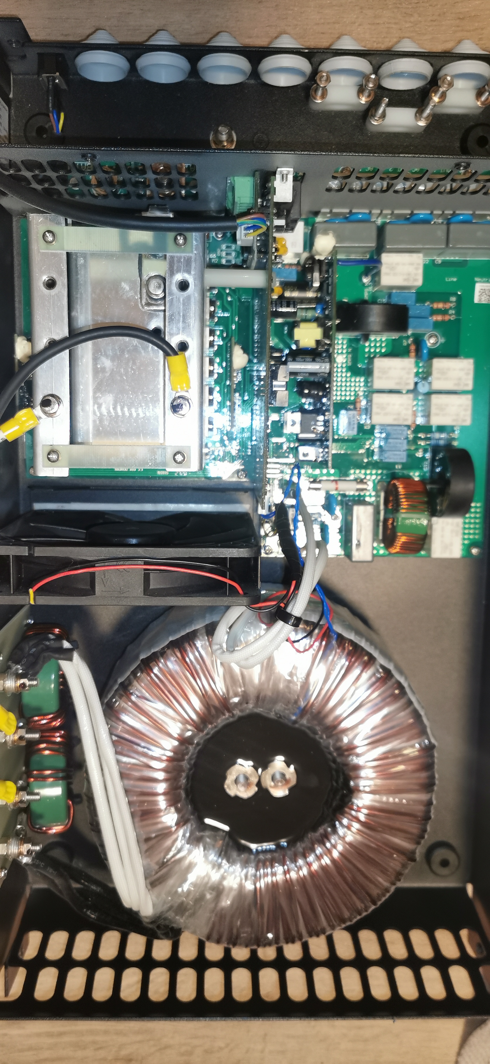 Když kouknu teďka na ten nákres tak mi dochází, že tenhle LF není vlastně galvanicky spojený s DS, jelikož to jde přes to trafo. Je mi jasný, že to tak jak si distributor přeje není, ale ten FET není prostě galvanicky spojený s DS. To že to jde paralelně s ds je věc druhá. Takže alespoň můj výzkum třeba někomu bude, aby viděl jak vypadá uvnitř a jaký ventilátor tam pasuje. Jinak mp2 5000VA má relé panasonic a to se taky cení.