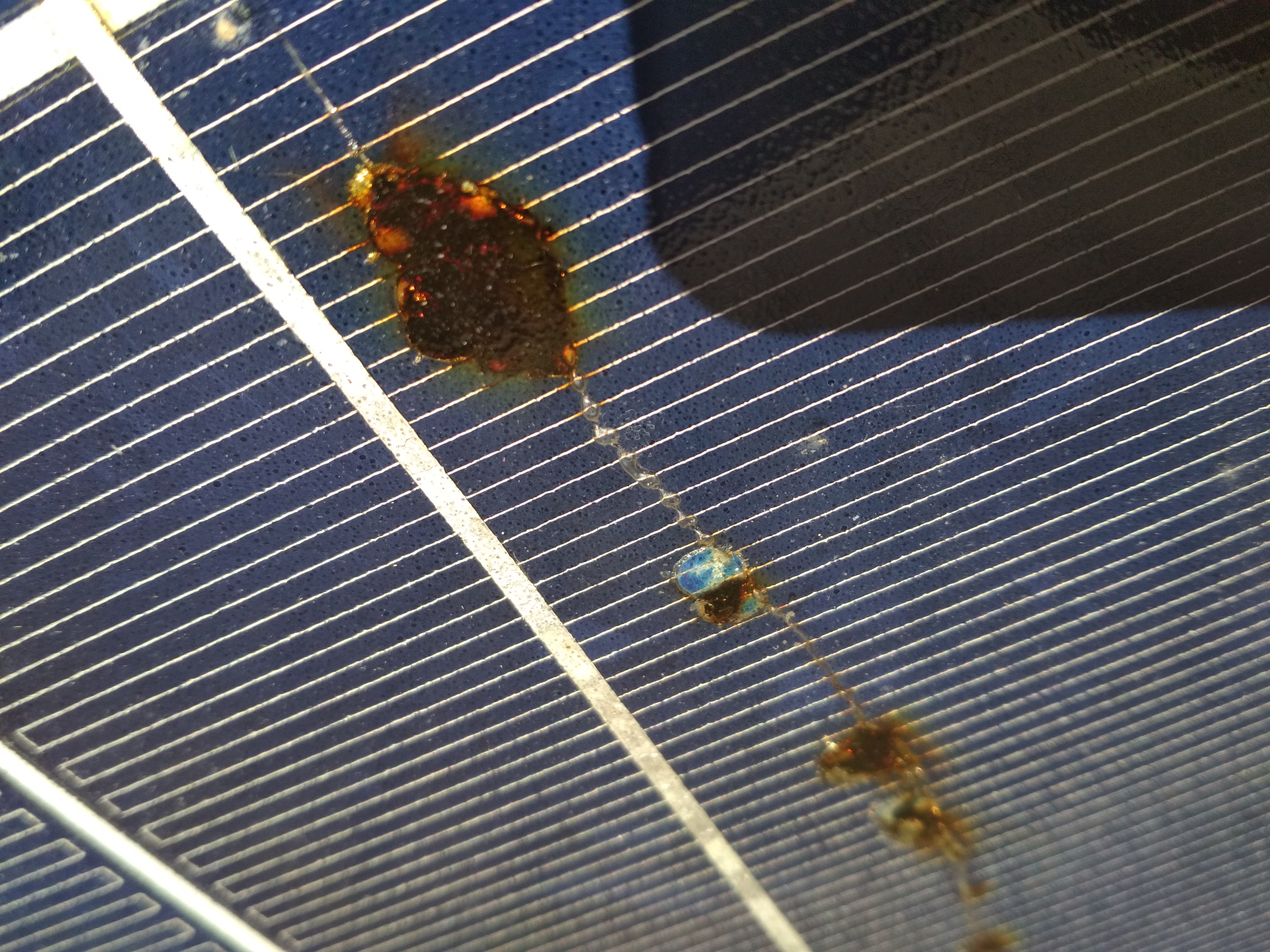 Našel jsem celkem 3 prasklé články na 2 panelech. Tenhle očividně praskl a procházející proud to místo ohřál. Další prasknuté články ty stopy po teplu nemají. Kupodivu napětí i proud se nijak neliší od ostatních panelů. Takže ty panely budu muset zkontrolovat ještě jednou a důkladně.rasto1 píše:Ako krytina super cena, ale tie clanky nie su prasknute, ale v skrate vyhorete.