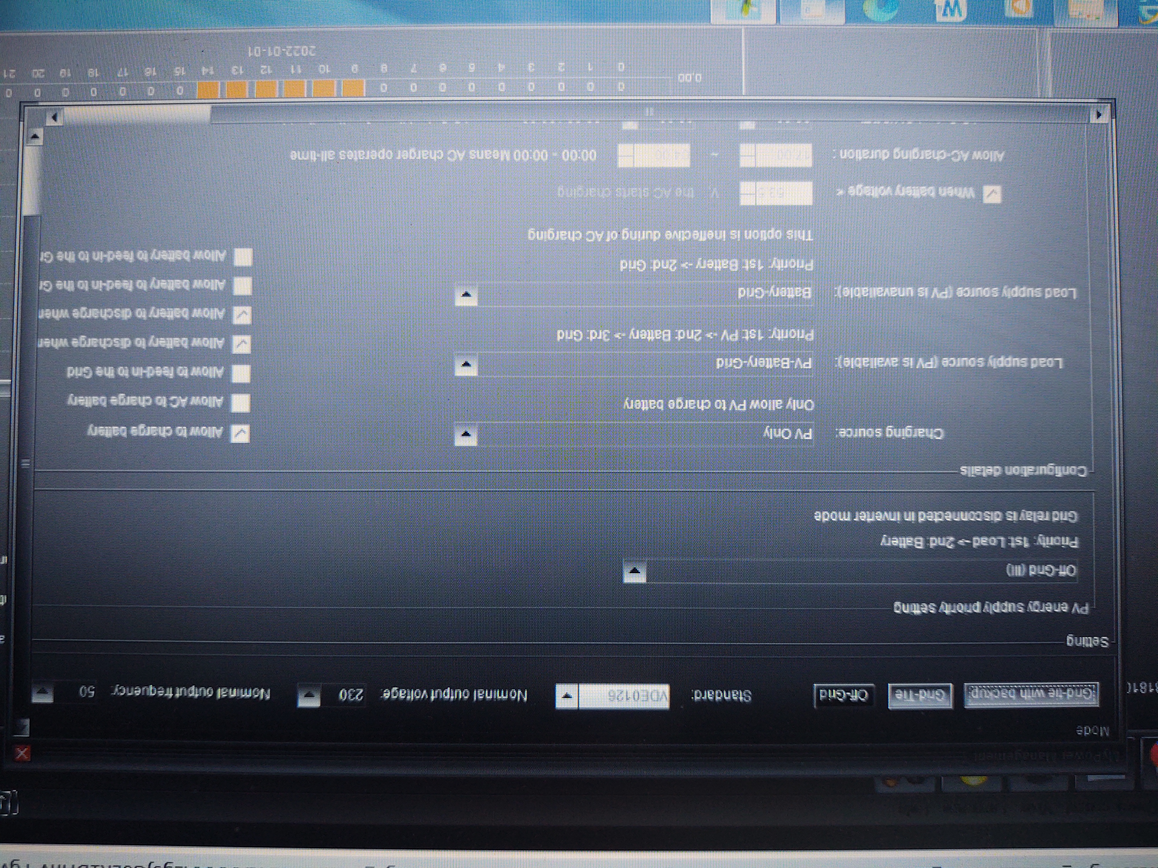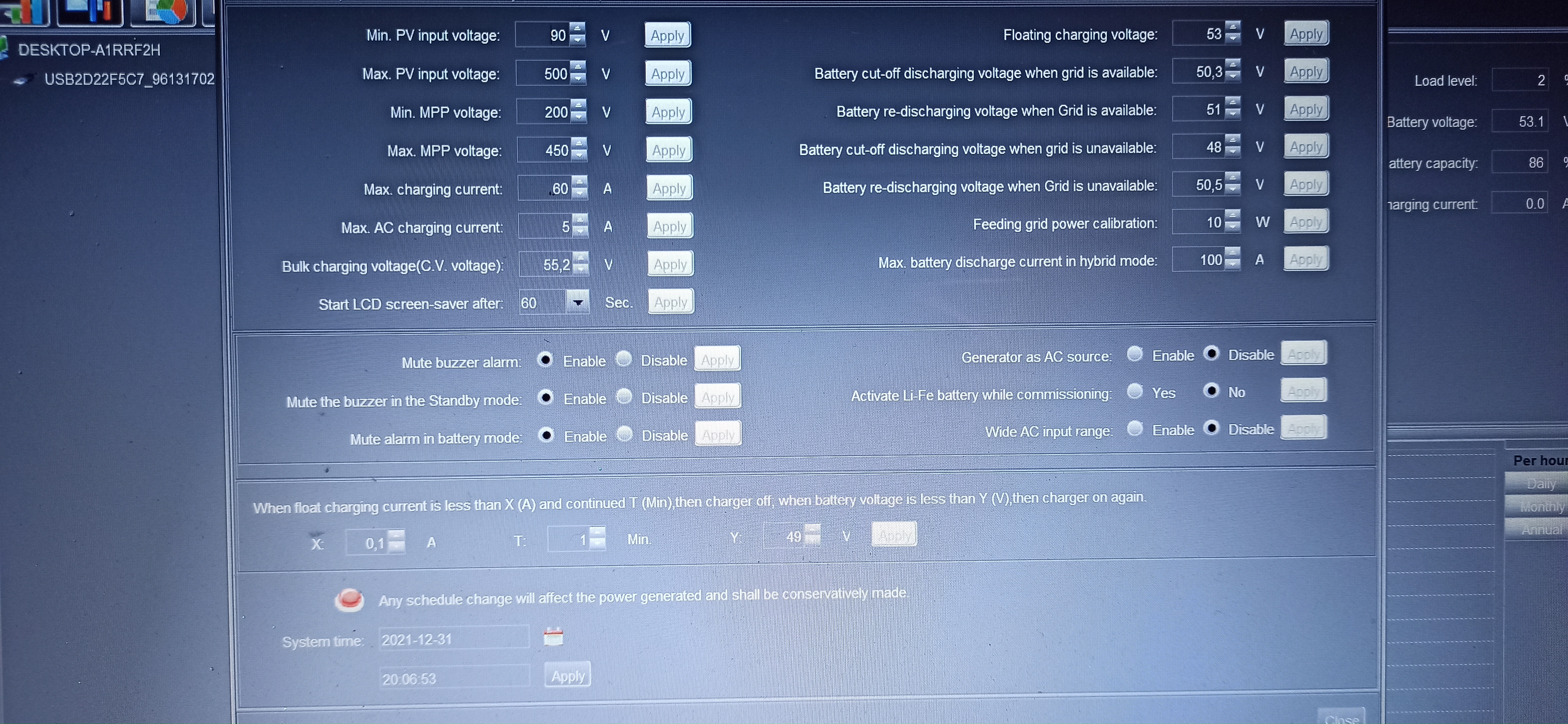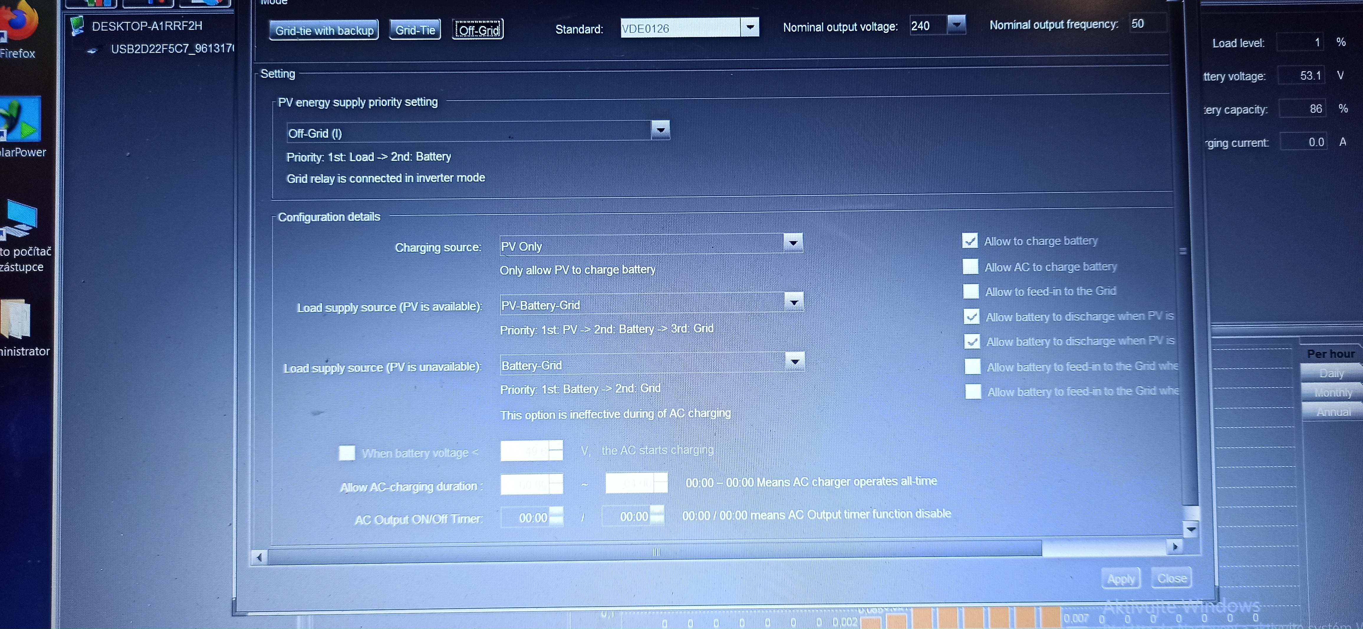 Prečo máš nastavené off grid I? Mám pocit že ja mám offgrid III navolené aby som nemal pretoky. Ďalšia vec, to máš 16s a nastavené iba 53V? WTF? Nastav si tam aspon 56V prosím pekne. Ak ti nejde nastavovať tak sprav tvrdý reštart. Battery cut of 50V a reconect battery aspoň 53V! Musí tam byť väčší rozdiel lebo ti to bude pripájať a odpájať baterku.