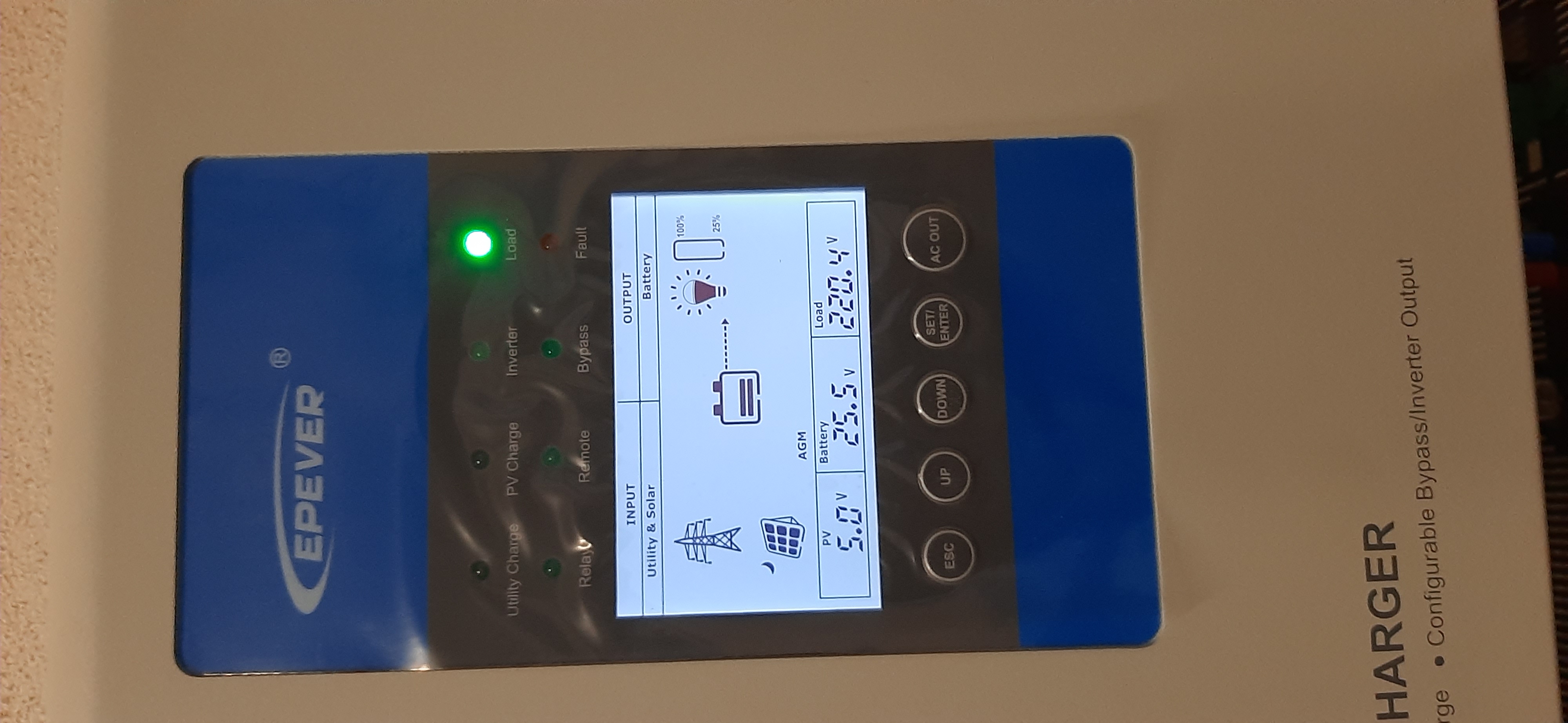 No keď ti bliká led Inverter tak musíš mať na výstupe napätie AC OUTPUT šedé svorky, nie ten istič.