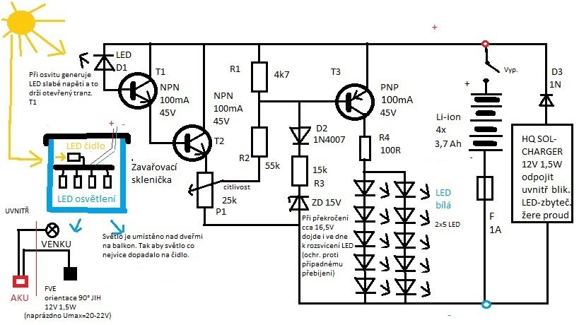 Přihodím pro inspiraci schéma té mé lampičky. "Skopec" projevil zájem o schéma, tak ho hodím rovnou sem. Třeba se někomu taky hodí. Nic složitýho a jistě by šlo vyřešit i elegantněji. Je to ze šuplíkových součástek co dům dal, baterky byly zachráněny před vyhozením do elektroodpadu, tak jsem jim dal šanci na druhý život. FV panel mi zbyl ze zrušeného auta, kde mi původně v zimě konzervoval baterku. Prostě jsem zužitkoval trochu toho nepotřebného elektrobordelu co mi bylo líto vyhodit. S pájením a instalací mi to zabralo necelý den a jeden večer vymýšlení. Víc jsem do toho nechtěl házet prachů ani času. Funguje to jednoduše, LED dioda je tu jako čidlo osvětlení. Ve dne generuje slabé napětí, to drží otevřený NPN tranzistor a ten naopak drží zavřený hlavní spínací PNP tranzistor osvětlení. Za soumraku (nebo při zatažené obloze) se situace otočí a plynule se pak rozsvítí LEDky na osvětlení. Regulátor tam nemám, vzhledem k "výkonu" je cokoliv jiného jen zbytečná ztráta. Jediná ochrana je tu pomocí zenerky, kdy při dosažení zvoleného napětí (nebo při odpojení AKU za jasného dne) dojde k rozsvícení lampičky. Je to provizorně-asi na furt vloženo do zavařovací skleničky nad vchod na balkon. Myslel jsem, že to exne tak do prvního půl roku, ale překonal jsem se a funguje to skoro 2 roky-vůbec jsem na to od instalace nešáh. Ty čínský solární lampičky to překonalo tak o 1000%. Na zimu doporučím vypínat, přece jenom ty baterky v zimě nejedou moc v ideálním režimu a nemá to žádnou detekci podbití. (Já na to samozdřejmě prdím a nechávám co vydrží, teď jde vidět i na intenzitě světla, že to není moc OK, léto je holt lepší.)