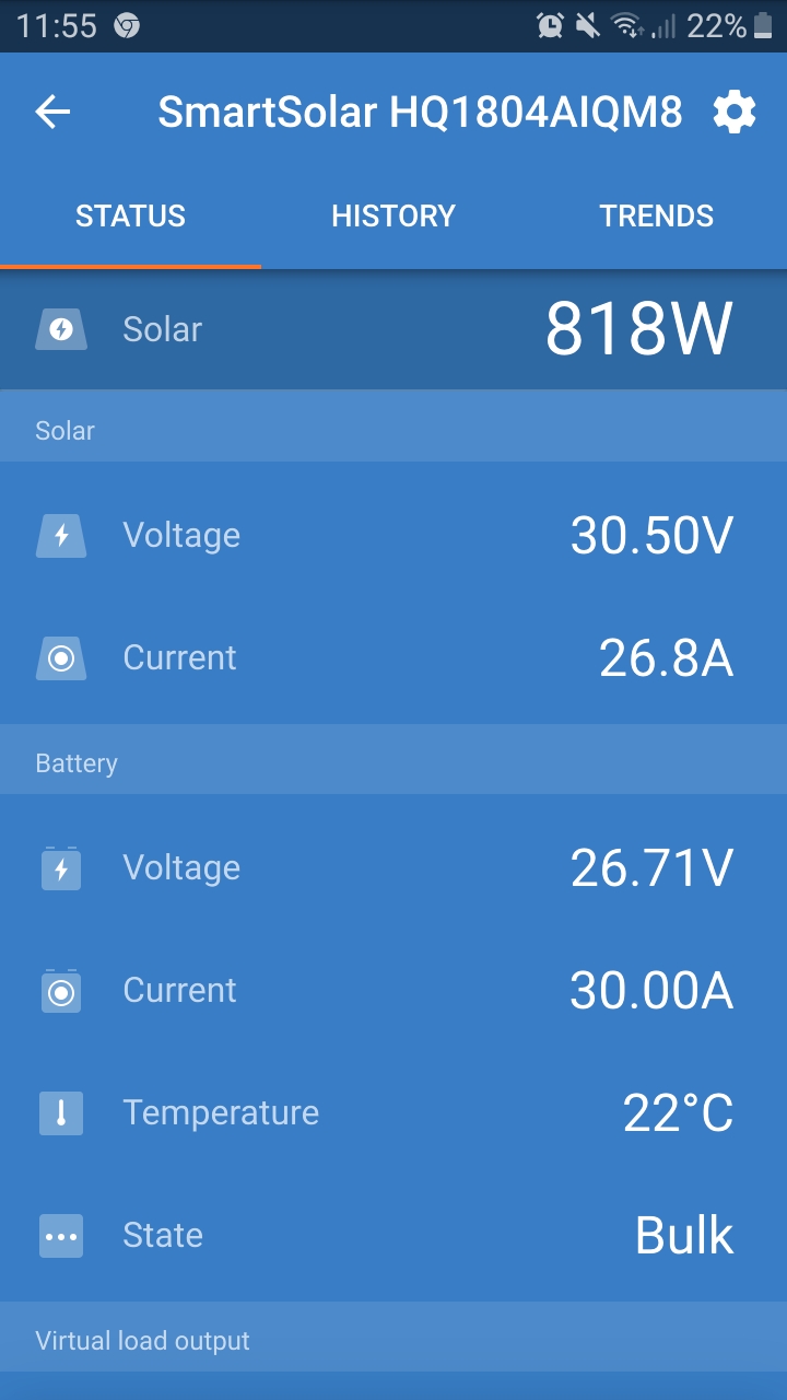 Po restartu naběhnou regulátory (mám 2ks) na 80A a po krátké době skončí oba svorně na 65A a omezují výstupní proud přesně na 130A. Panely jsem přidával o víkendu, ale až teď nějak zasvítilo. Trochu jsem se v tom hrabal a mám pocit, že se to takto začlo chovat po tom, co jsem se hrabal v parametru "Type of MPPT tracking - 10075". Ale těžko říct. možná i konečně dostal zabrat. Doteď bylo 8kWp panelů na 2ks VT.80 a nikdy tam tolik nebylo.