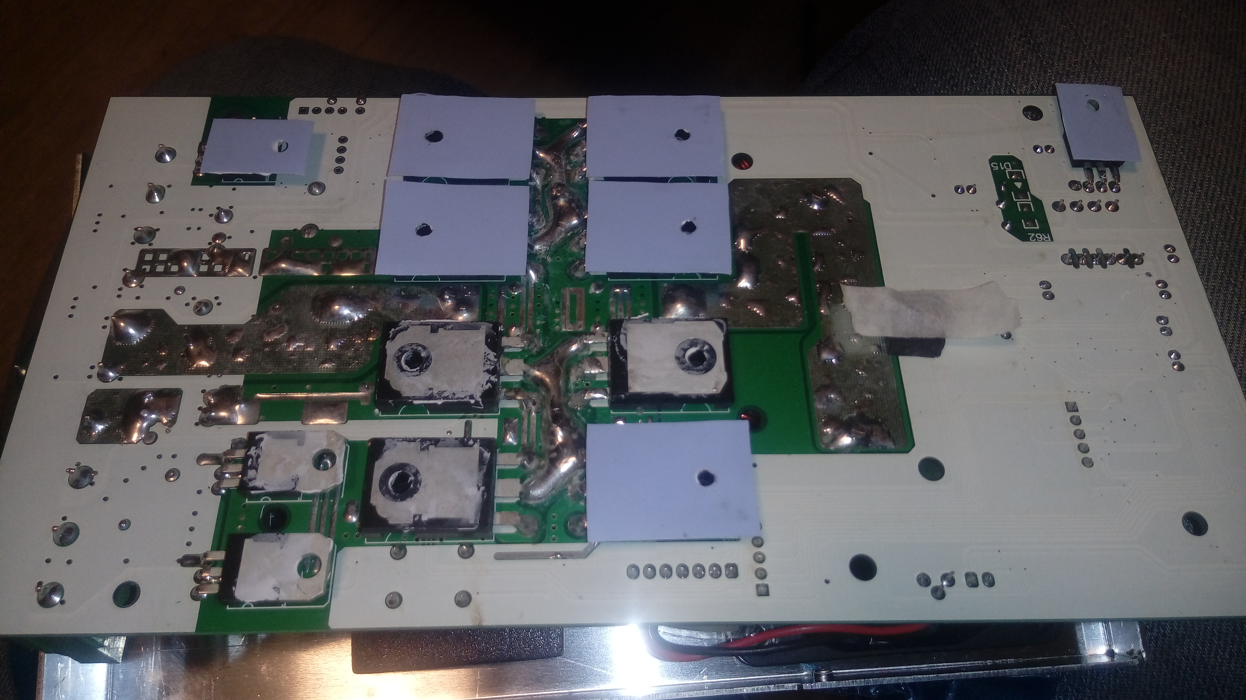 Ahoj já jsem opravil jen jednu cestičku, mezi tranzistory 1.a 2. hned zvrchu... takto bylo letováno, cínováno z výroby...kodl69 píše:S tím přidáváním cínu, teda vlastně olova - víš o tom, že olovo má víc než 10x větší měrnej odpor než měď? Kdybys do toho zatavil 1.5mm2 drátek, tak to bude mít ve výsledku větší proudovou zatižitelnost. Ale zrovna z tohohle bych strach neměl...