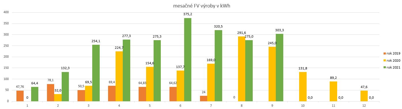 7/2021 = vyrobených cca 320 kWh (FVE-1: 89 kWh, FVE-2: 108 kWh, FVE-3: 124 kWh)