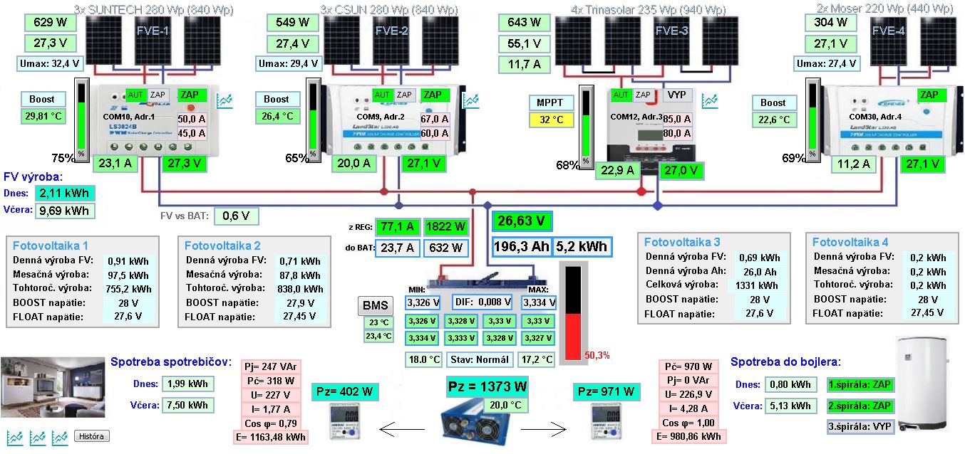 Objavil sa ale problém s prebytkom FV energie - baterky plné, bojler nahriaty... takže posledné dni som odpojil FV-4, napriek tomu stále prebytky.