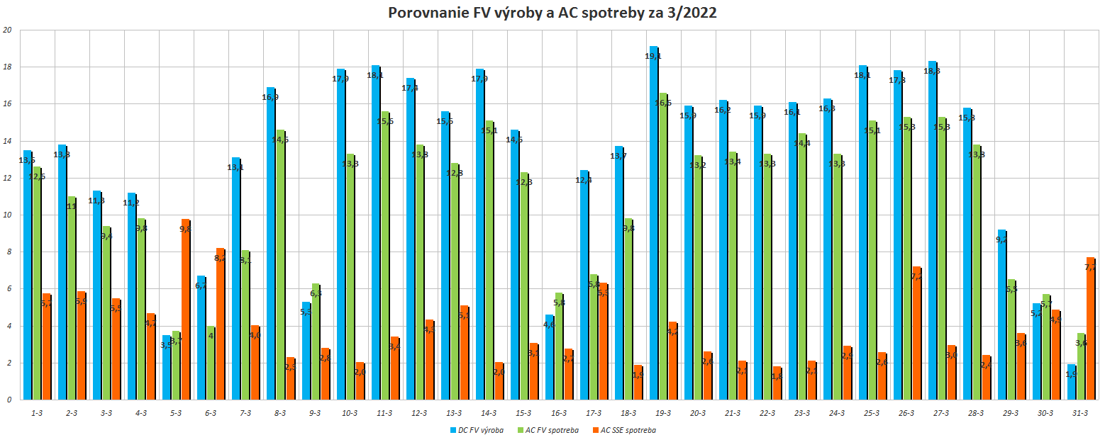 No a kedže som začal sledovať aj AC spotrebu od dodávateľa EE (SSE) tak mám aj denný graf porovnania DC výroby, AC spotreby z FV a AC spotreby od DS: