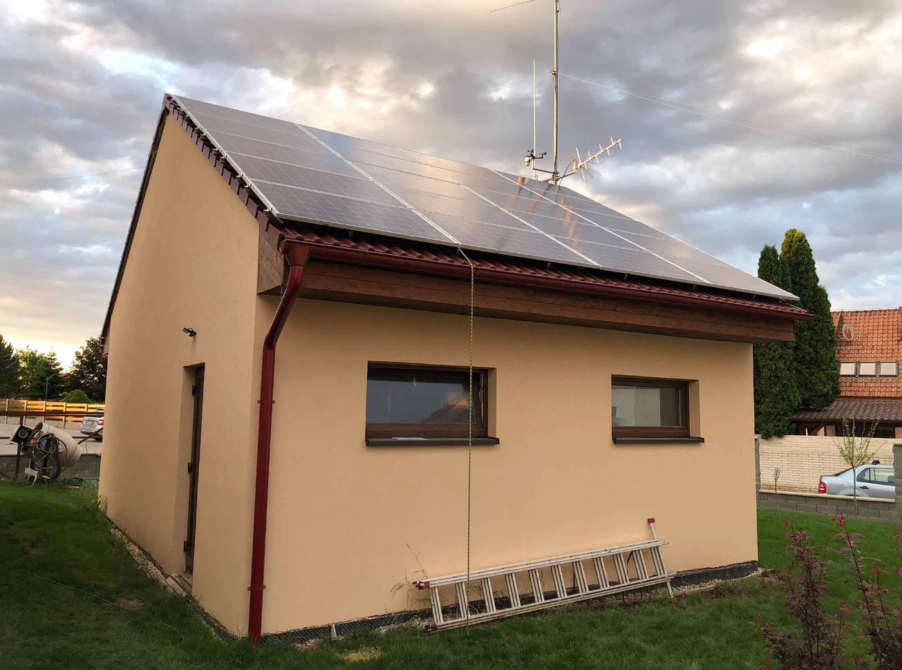 Tak už vše tak nějak jede. Zatím jen jeden string panelů a není pořešení vytěžování. Garáž jede v ostrovním režimu několikátý den, učím se s tím. Chystám poslední materiál a začnou přípravy střešní konstrukce.