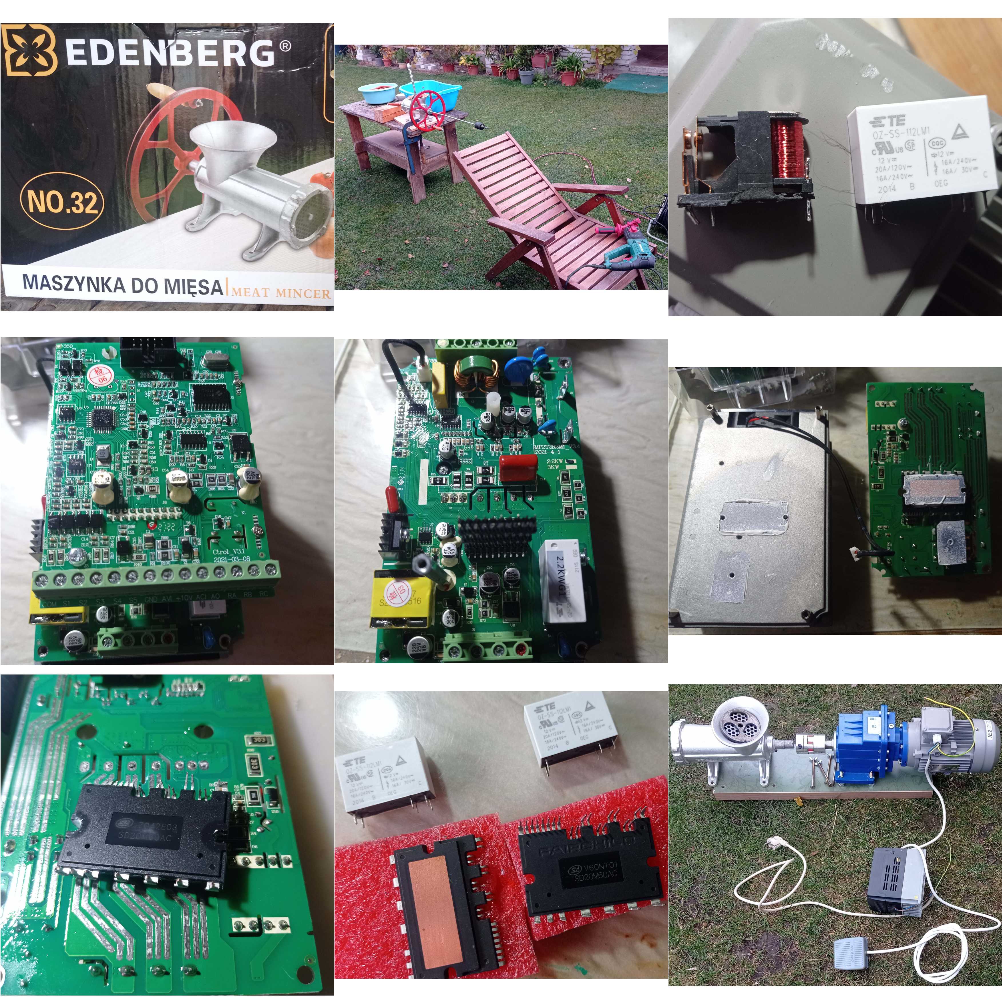 Druhé řešení - Mlýnek má řemenici, takže je připraven na strojní pohon, ale mám pochybnosti, jestli by boční síla od řemene nevydřela časem pouzdro hřídele mlýnku, které je z nějakého plastu. Proto počítám s pohonem přes spojku pomocí motoru a převodovky, které mám k dispozici. Motor je 3x 230 V 600 W a chci regulovat otáčky - tedy to chce 3f frekvenční měnič.