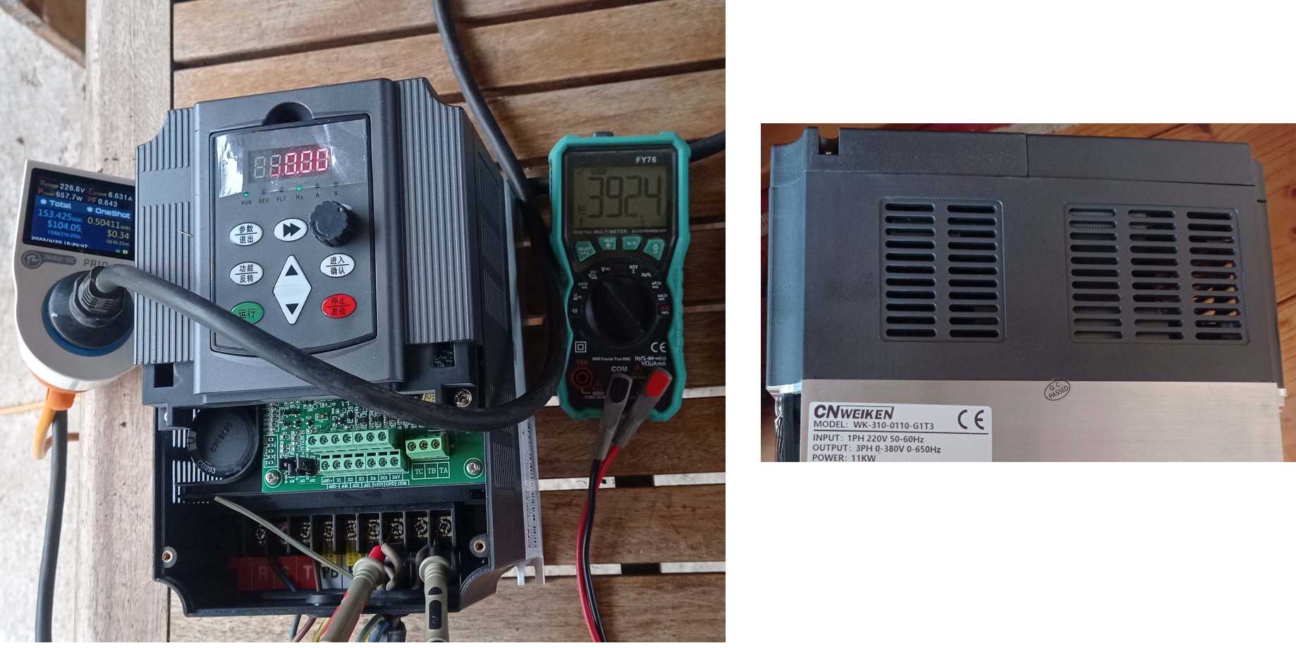 Ještě jsem vyzkoušel ten zvyšující frekvenční měnič, který z 230 V udělá 3x400 V. Trošku jsem se obával, jak provádějí zvýšení napětí, aby neodebírali z 230 V jen jednu polaritu, což HF měniče (alá Axpert) nemají rády. Schématické zapojení ze stránek výrobce není moc optimistické http://www.cnweiken.cn/en/list/49/175.htm, ale asi používají jiné zapojení. Proto jsem pro případ výpadku preventivně odpojil FV panely. Ukázalo se, že zbytečně. Měnič co mám (11 kW) při zatížení 1 kW dává 3x400V. Na vysoký odběr z jedné fáze nemám připravený rozvod, tak jsem to zkoušel na cirkulárce a štípačce celé připojené přes "zásuvkový" měřák, který má elektronickou pojistku nastavitelnou na max. 4000 W. Párkrát to ta ochrana vypnula, ale i takto je to použitelné. Bude to chtít 1f zásuvku 25A někde na fasádě.