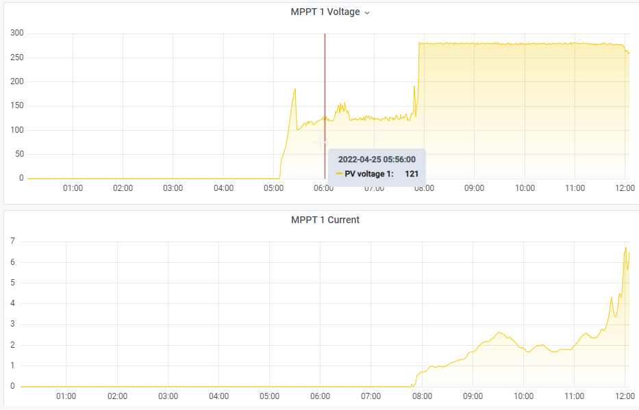 Mám MAX 3,6 kW s 500 V MPPT a dnes ráno se dělo zhruba toto 5 - 5:30 se objevilo světlo. Napětí na panelech začalo stoupat a regulátor se probudil při 190 V. Začal zatěžovat panely a napětí se snížilo na 120-130 V. Tou dobou samozřejmě musí už téct z panelů nějaký proud. Na to on ale kašle, ukazuje 0 A a ten prd, co z panelů dostane, utopí ve vlastní spotřebě. Na měření z baterie (jde mimo Axpert) kolem 7:15 už vidím, že z panelů už pokryje vlastní spotřebu. Výkonu by tam mělo už být víc, kdyby nedržel napětí dole, jak je vidět cca v 7:55, kde dojde ke skokovému nárůstu výkonu. Regulátor tedy potřebuje proud cca 0,7 A, aby začal normálně fungovat. Přitom mohl dávno zvedat napětí a nějakých 100-150 W by dostal už o hodinu dřív.