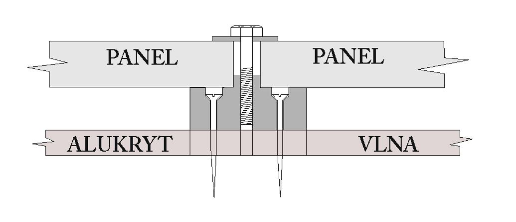 Tak nakonec to vypadá takto. V Profilu je čtyřhranná nerez matka M10, závitová tyč prochází středem vlny, prkenným podbitím (dvě coulová prkna sešroubovaná křížem přes sebe) a ze spodu je pak velká podložka s maticí. Občas to vyšlo do trámu, většina je kotvená jen v těch prknech. 1 panel je zespodu podepřen AL dorazem a přitažený tím L-kem, mezi panely pak je jen šroub M8 s velkou podložkou, nahoře zase to L-ko. Kromě závitových tyčí je vše v nerezu A2 nebo hliníku.