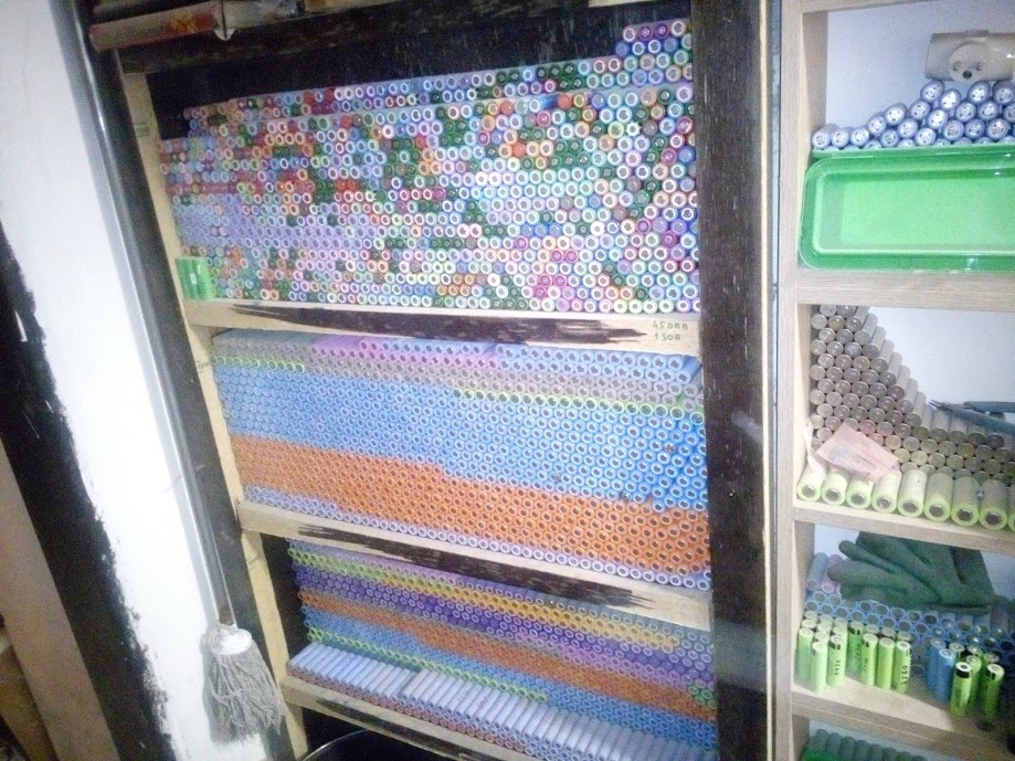 V hornej poličke je cca 1500 článkov z čoho vyjde 15S 100P a odhadovanou výslednou kapacitou 190Ah neobsahuje články s menšou kapacitou ako 1,5Ah - v pomere 1:4