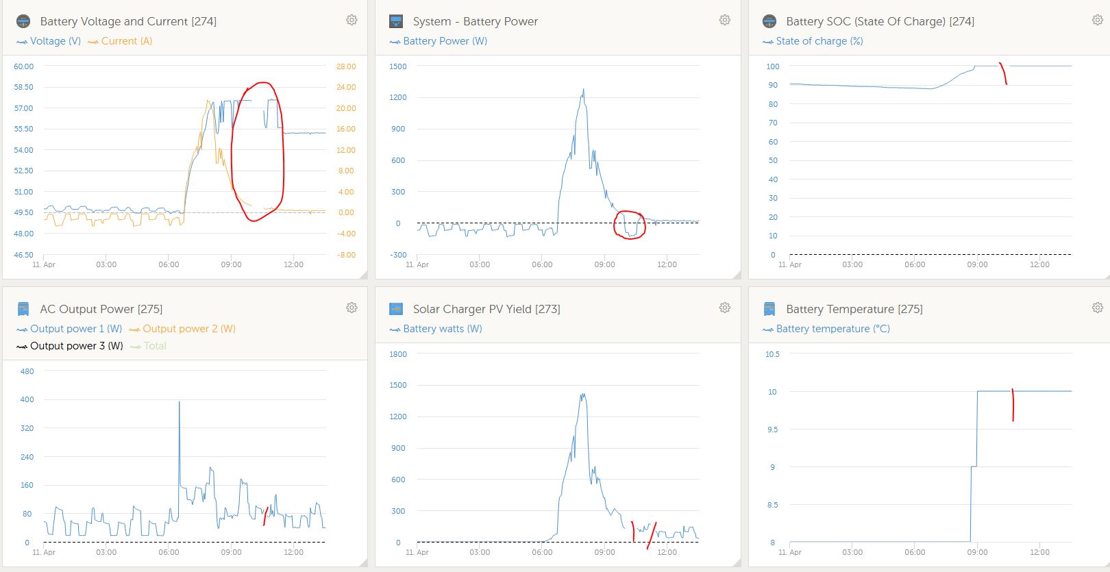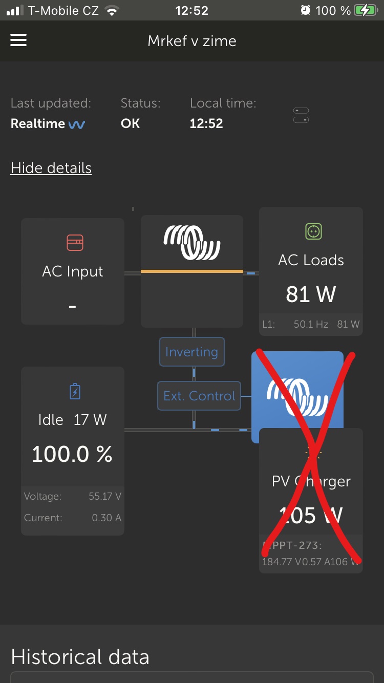 2)pravidelně mi vypadává komunikace některého z komponent v Easy Solar. Někdy vypadne SmartShunt, někdy MPPT regulátor. Systém jako takový funguje bez přerušení ale poznám to z přehledové obrazovky VRM. Systém mám v provozu teprve 14 dní, takže jej teprve testuji bez připojení na síť. Většinou pomůže kontrola update, když si šáhne na všechny adresy. Co mě znepokojuje, jestli to, že když vypadne MTTP a je výkon ze soláru, přejde zbytečně na bateri. Sice bez výpadku na výstupu měniče ale přejde. Jde to vydět z posledního obrázku. Červeně jsou vyznačeny ztráty komunikace. FW mám všude aktuální. Měnič mám nastavený v režimu ESS, jelikož chci testovat připnutí GRID při podkročení SOC ale pokud se nezbavím tohoto problému, mám strach to na síti provozovat delší dobu kvůli přetokům.