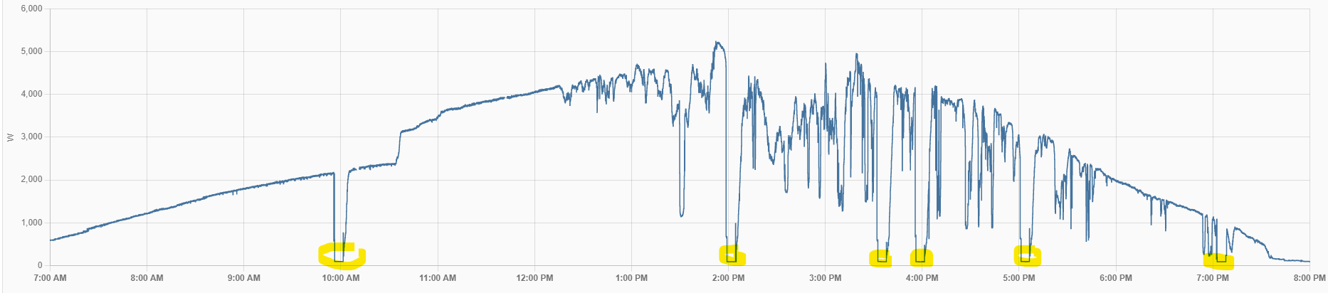 Chtěl jsem dělat podrobnější měření a záznam napětí, ale jak teď pořád pere slunko, tak jsem výpadky vyřešil odpojením měniče od sítě a přechodem na plný ostrov. Časem se tomu budu zase věnovat.