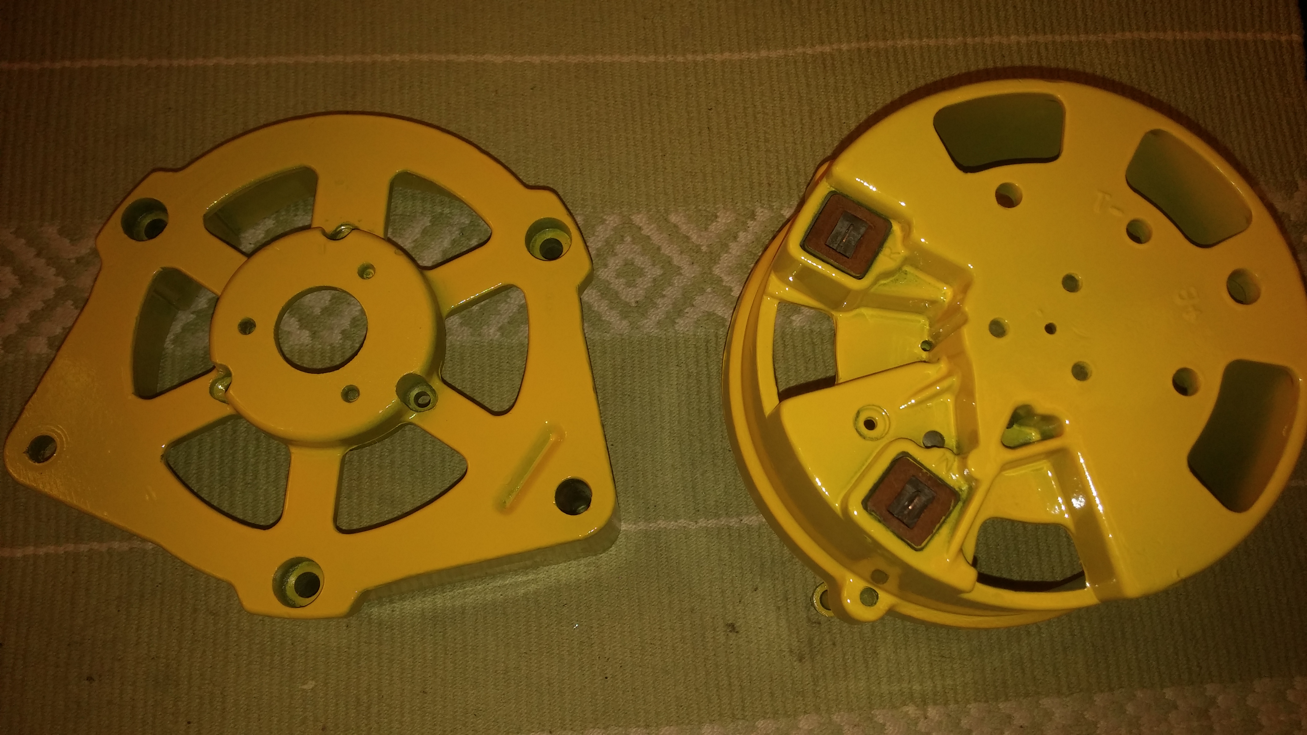 Přidám další krátký foto-update práce za dva dny. Proběhlo očištění mastné špíny z břemenových vík a že to byla docela olejnička, odmaštění, lehké zbroušení šmirglem a nástřik barva+bezbarvý lak. Nejsem nějakej extra "stříkač" a žlutá je prý nejtěžší barva. Tak odpusťte lakýrníci případné nedostatky, ale snad se to i docela povedlo. Teď mi má přijít lakovaný drát CUL 0,5mm tak se ozvu zase na navíjení statoru.
