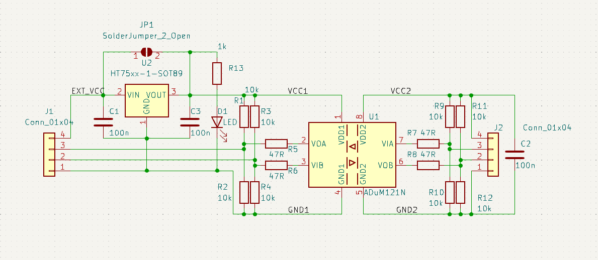 Tohle ted pouzivam ... Jedna strana 3.3V-30V a druha 3.3V-5V. Cislicove izolatory od analog devices. Desticka asi tak do stokoruny. Daji se tam dat jak obousmerne tak jednosmerne izolatory nebo jine typy treba na i2c. Soucasne to je level shifter by design. Holtek regulator do 30V pak dovoli pripojit zarizeni, co ma vyssi napajeci napeti. Treba JBD BMS nebo modrasek. JKBMS jsem pak pres to pripojil taky, ale predradil zenerku a odpor, na srazeni napeti na asi 12V. Samozrejme neni potreba osadit vse ale jen to co clovek potrebuje.
