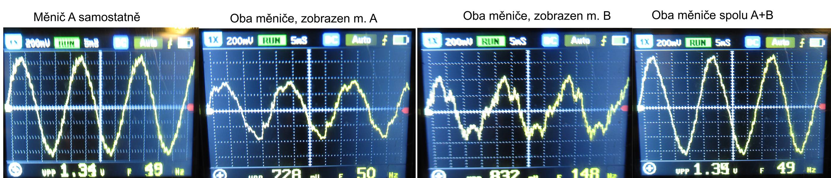 Dneska jsem prováděl nějaké měření na dvou paralelně pracujících měničích a jsem z toho trochu zmatený. Potřebuju vědět, v kterém okamžiku naběhne druhý paralelní měnič. Říkal jsem si, že nejjednodušší bude, provléknout z jednoho měniče fázový a z druhého nulový vodič jedním jádrem proudového transformátoru. V případě, že poběží jeden, bude se v něm indukovat proud, když oba, tak se budou sinusovky vzájemně rušit a proud by měl být nulový. Nejdříve jsem si to ověřoval pomocí klešťáku a pořád mi to nějak nevycházelo. Tak jsem na to vzal proudový transformátor, připojil osciloskop a nestačil se divit. Při chodu na jeden samostatný měnič (A), byla sinusovka vcelku čistá. Když jsem měřil na dvou paralelně pracujících měničích, na samostatných fázích jednoho (A), nebo druhého (B) měniče, tak ta sinusovka se různě potvořila, každou chvíli byla nějak zkreslená. Když jsem ale cvaknul proudový transformátor na oba fázové vodiče (A+B), tak ta výsledná sinusovka byla zase skoro čistá.