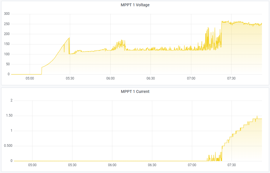 Obrázek bude asi lepší, než dlouhý popis. Zkrátka regly v Axpertech, co mají MPPT od 120 V (můj případ), nedávají dobře začátek/konec dne, případně silně zataženou oblohu. Jak sleze výkon pole pod nějakých 200 W, tak to začne kravit.