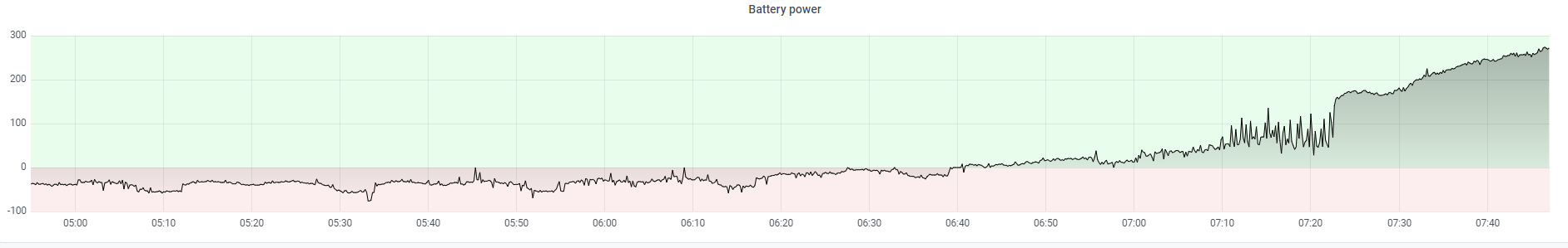 Vytáhl jsem k tomu ještě měření výkonu na baterii - to jsou data z Victron SmartShuntu. Prakticky se začalo něco dít až v 6:40, tedy hodinu po dosažení startovacího napětí regulátoru, kdy to nebylo schopné ani pokrýt vlastní spotřebu měniče - byl v bypassu.