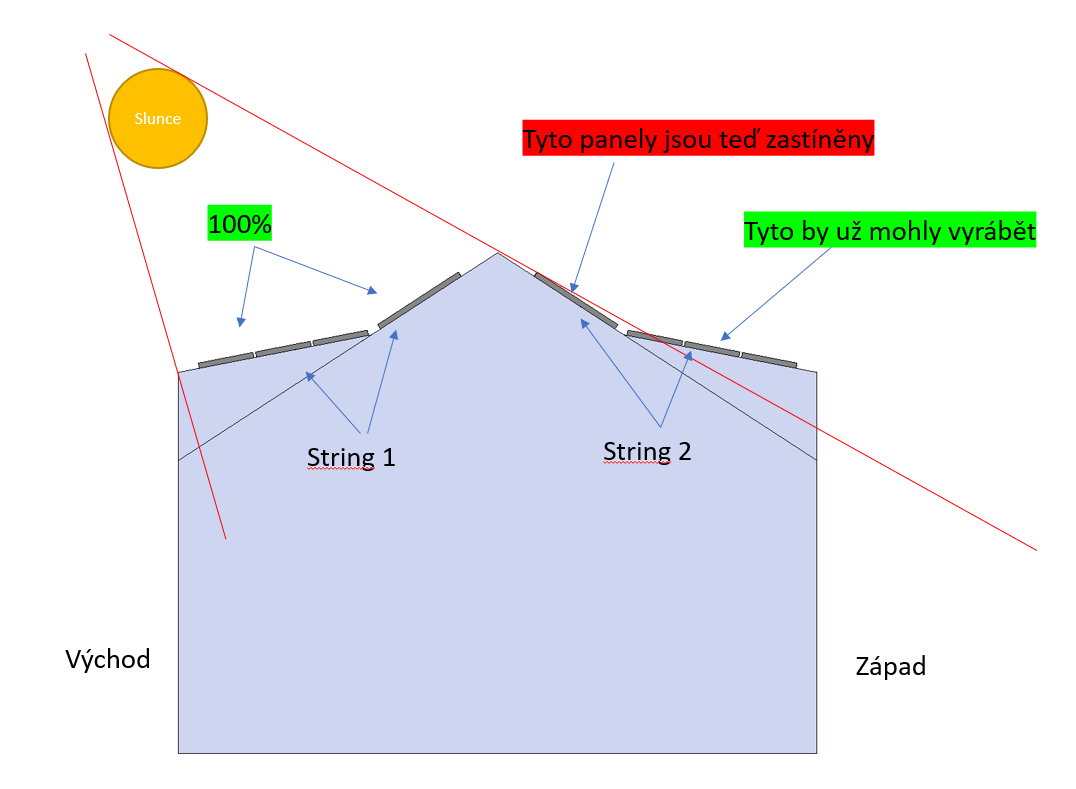 Nebylo by v tomto případě výhodnější mít 4 stringy? Jednu chvíli bude zastíněna celá řada panelů.(viz obrázek) Tím pádem "string 2" nebude vyrábět a přesto by mohl.