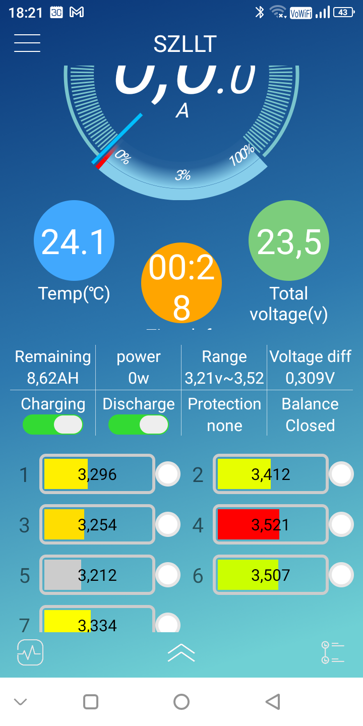 DIYBMS používám, ale teď jsem vyzkoušel kombinaci smart BMS a přelévacího balanceru s ETA3000 na 7s akumulátoru z baterek z elektrobusu, cca 300Ah na článek, s celkem velkým samovybíjením, každej samozřejmě jinačí. Začátek byl katastrofický, včera večer jsem to složil a začal nabíjet, viz obrázek ze smart bms z telefonu: