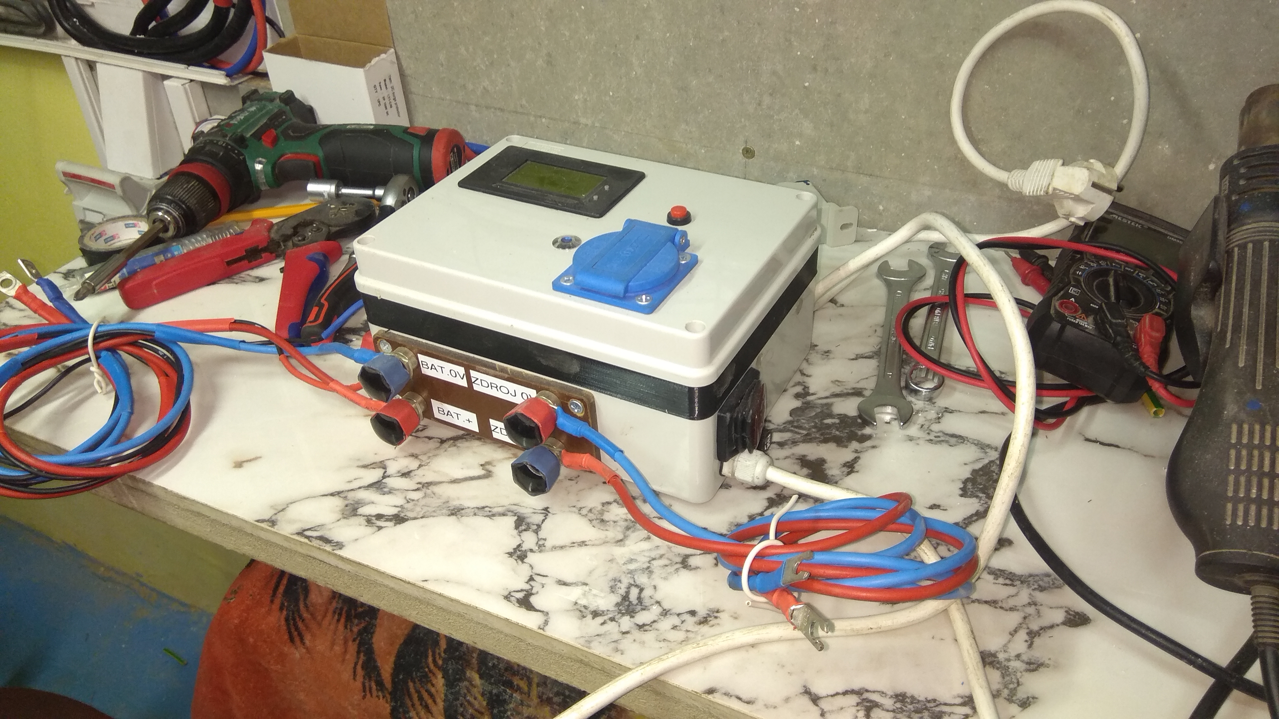 Snímání napětí a proudu je samozřejmě čtyřvodičové.Pojistka je pro případ selhání nabíječe aby nedošlo zpětným proudem k požáru nebo vybití baterie.Tlačítko na panelu nahazuje stykač což při skončení nabíjení zabranuje cyklování po odlehčení baterie a poklesu napětí.Krabice je zvýšešna 3D tiskem,stykač byl vysoký.