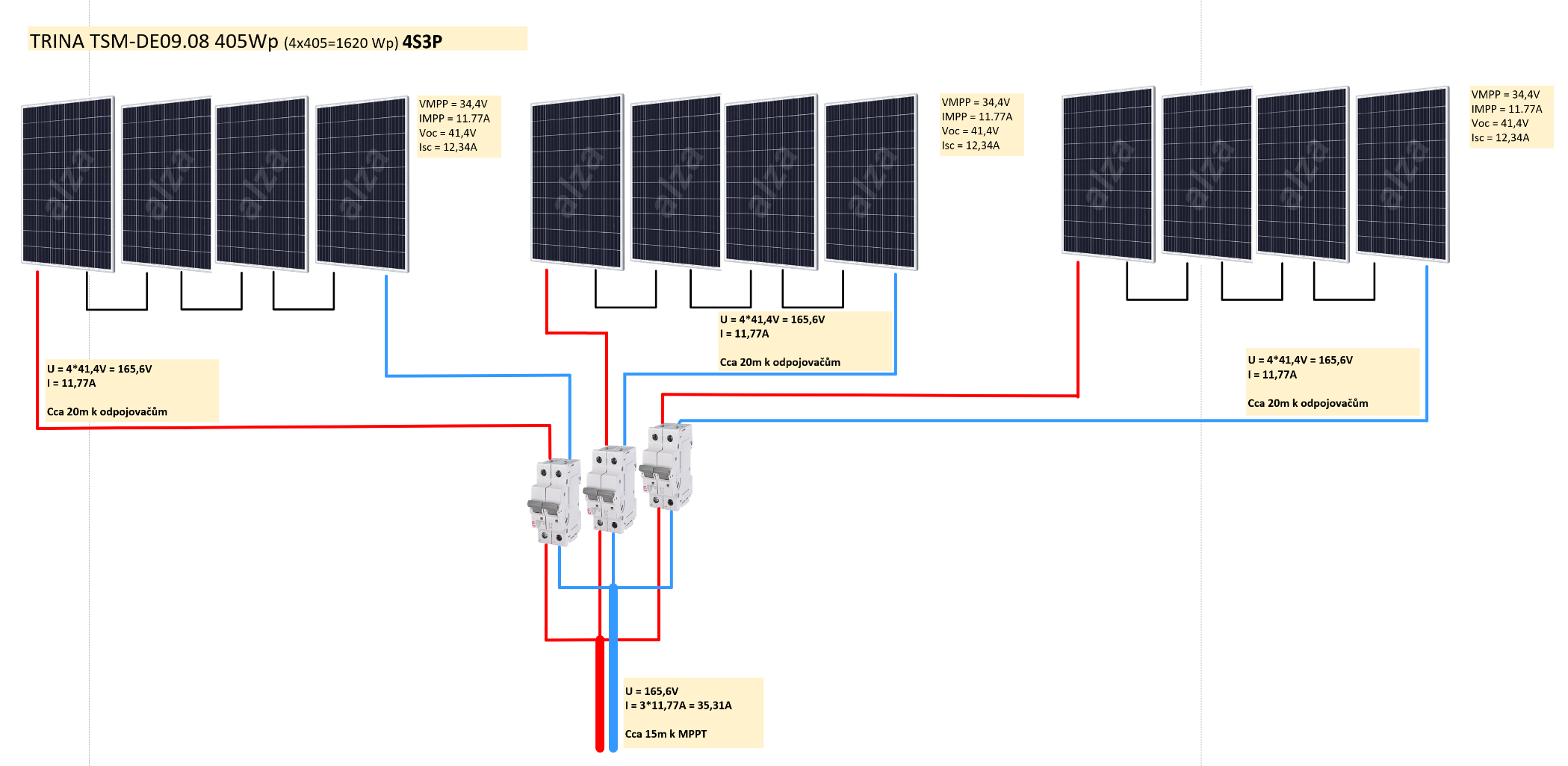 Panely by měly být 4S3P - původní nápad byl: od každé 4ice vést 2x6mm solarni kabel (cca 20m), pod střechou na půdě udělat krabici se 3 odpojovači a svodičem přepětí, za odpojovači kabely paralelně propojit a do technické místnosti pokračovat 2x10mm (cca 12m) k MPPT.