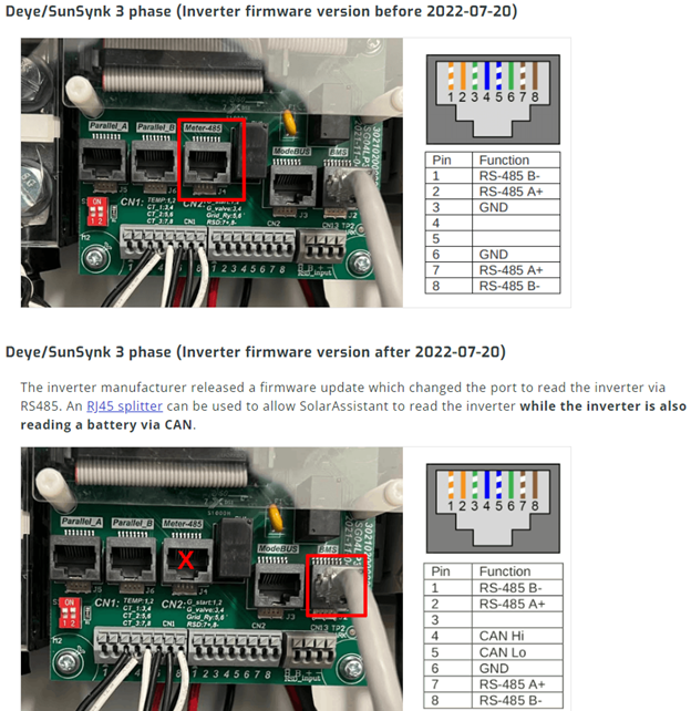 Na SA jsem nasel instrukce, ze je mozne pripojit na RS485 (v zavislosti na verzi firmware var 1) meter 485 nebo var 2) pres rozdvojku na BMS conector pro fimware od 20.7.20022 - viz obrazek ):