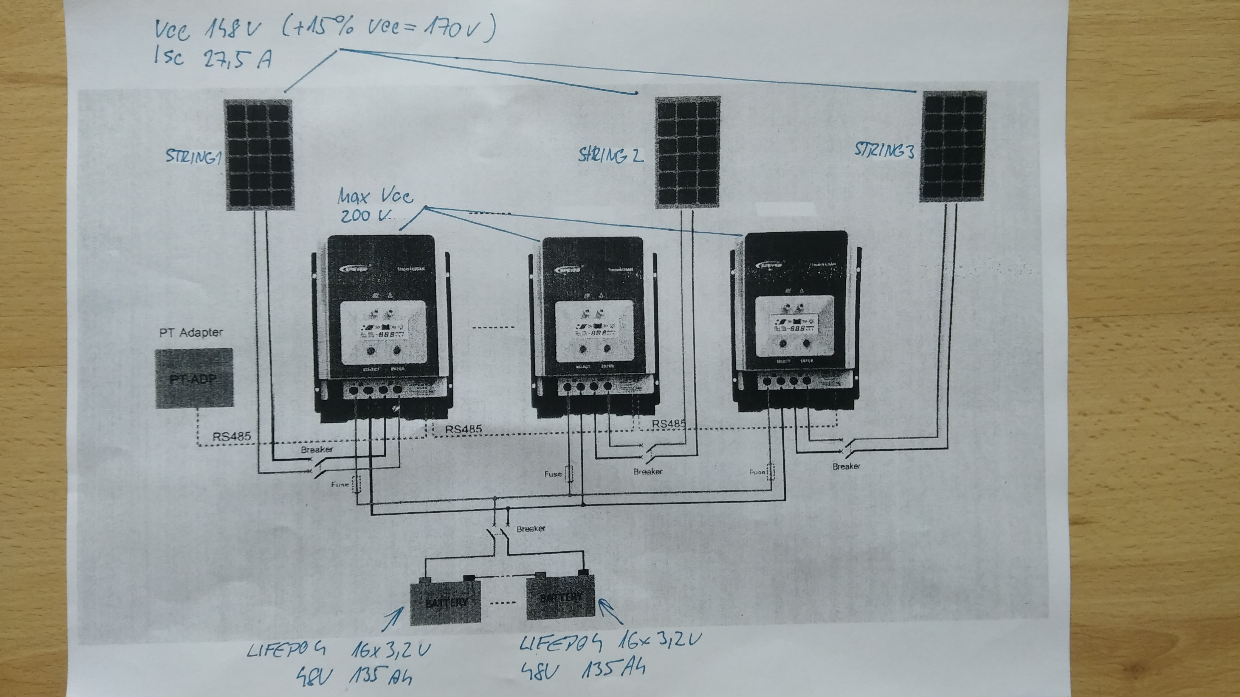 na tej schéme máš nakreslené 2 batér.bloky á 48V do série... predpokladám že je to chyba a majú byť zapojené Paralelne na 48V systém.